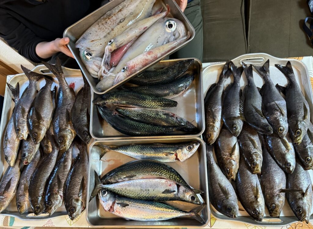 イサキいっぱい、デカサバ、アカイカ、アオリイカ。その前にあげたキハダマグロもあるし、これだけあれば十分です。デカサバは〆鯖で頂きます。