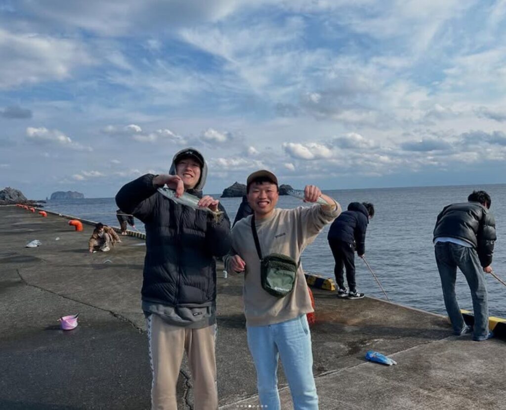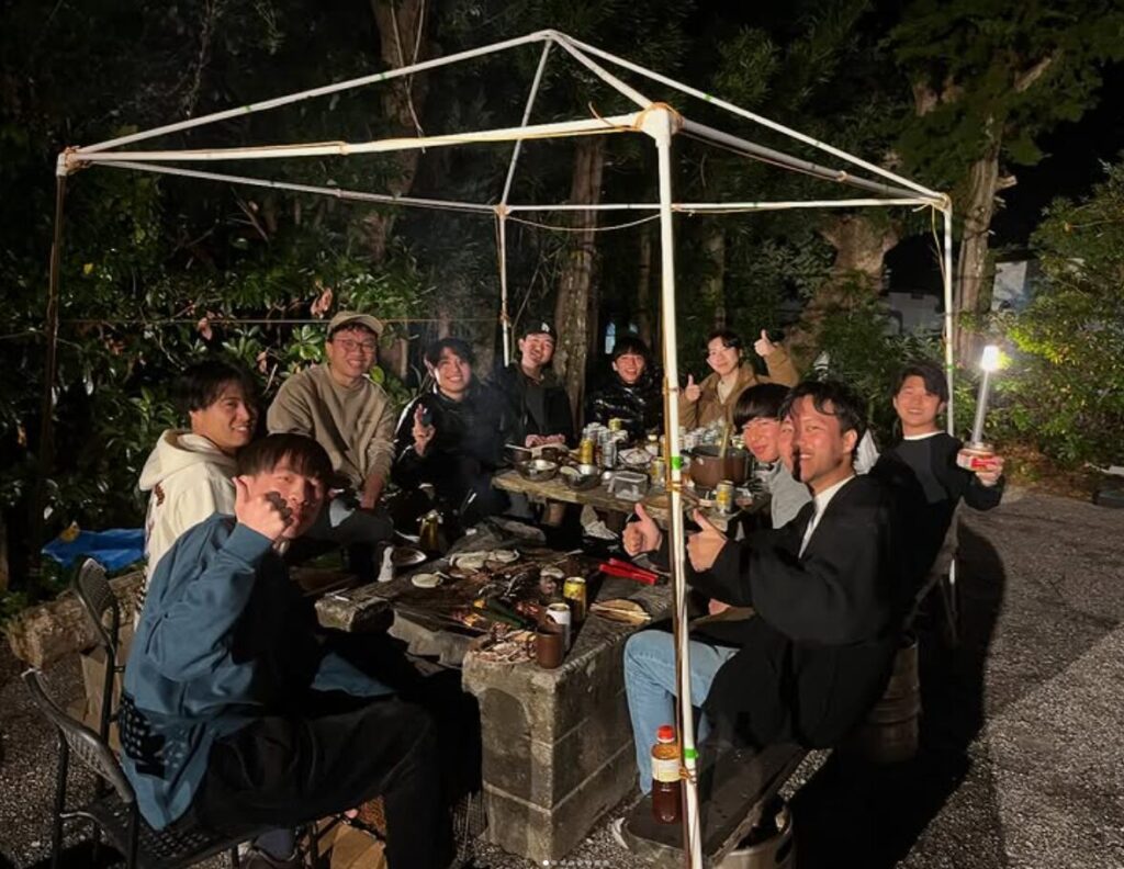 ひだぶんゲストブック 釣りしてムロアジ&BBQ!仲良し男子旅 2025年3月16日 hidabun BBQ, ムロアジ 10人でドミトリー1泊、1人3,000円➕みやとらさんバーベキューセット1,500円(炭別)+宮房釣具店の竹竿レンタル1,000円で、この楽しさです!