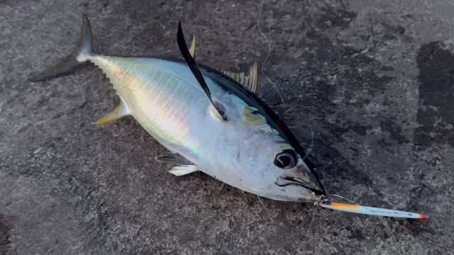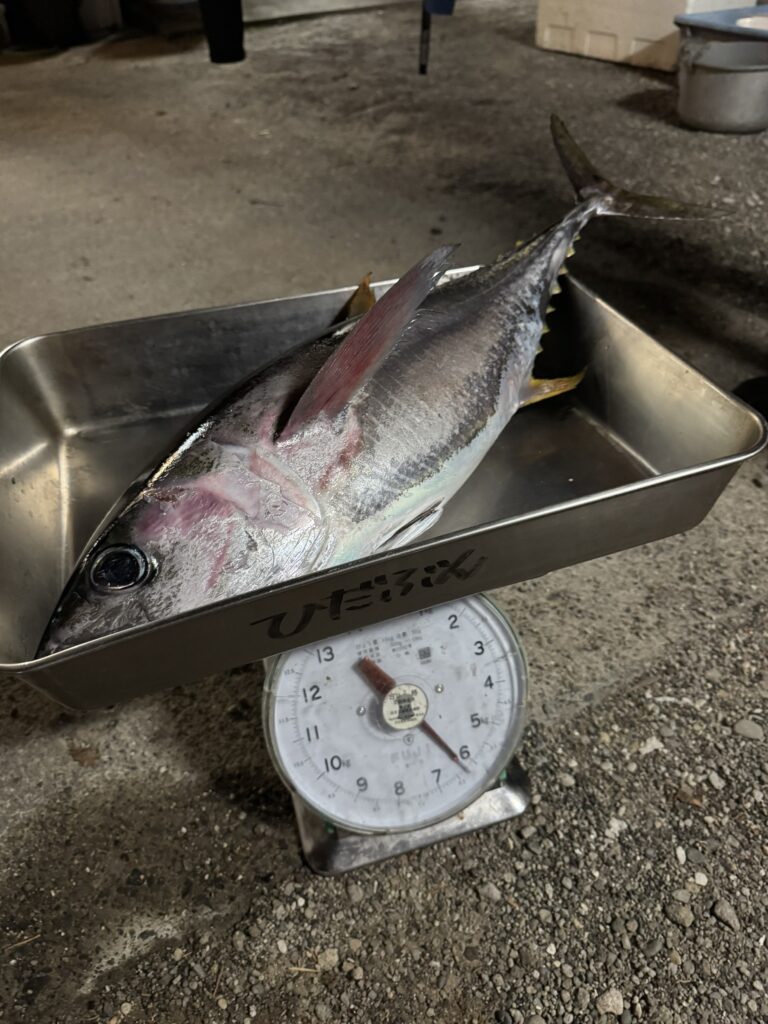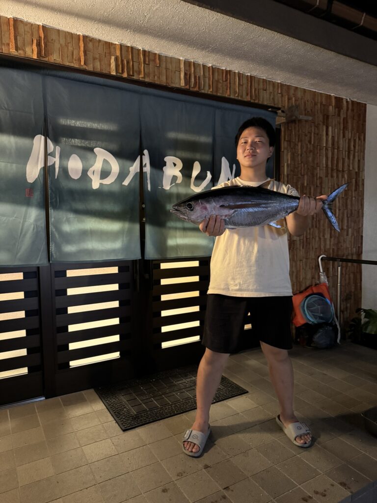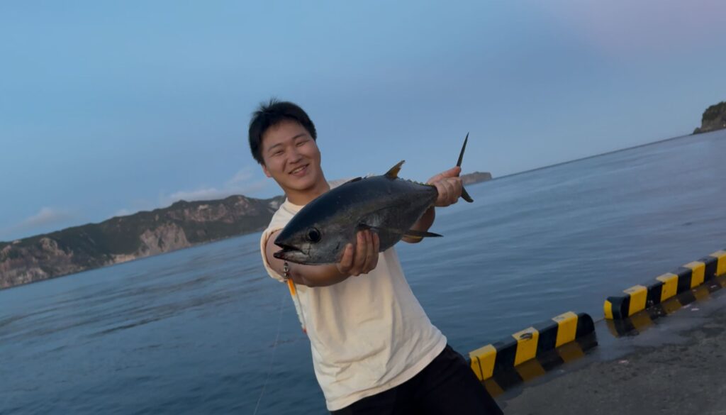 式根島の釣果|釣ったど!獲ったど! 桟橋からショアジギング・キメジ(キハダマグロ幼魚) 2025年7月23日 hidabun ひだぶんスタッフ新メンバーの大学生、ヒデくんの釣果2夜連続です!(昨夜はこちら)今日は桟橋からジグでキメジ(キハダマグロの幼魚)をGET。式根の釣りの神様に愛されて、だいぶ楽しい夏休みなってきました。