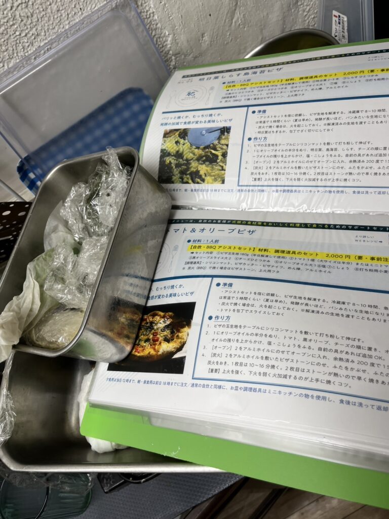 このピザはミールキットなので、生地を伸ばして、材料をのせて焼くだけ。BBQスペースだけでなく、室内のオーブンでも焼けますので、気軽にご利用ください。