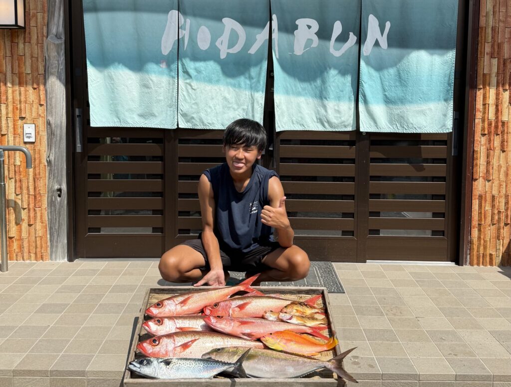 式根島の釣果|釣ったど!獲ったど! 釣り名人大学生その2のオフショアギング釣果 2025年8月31日 hidabun 今年のひだぶん夏バイトは人材に恵まれて釣り名人揃いです!あとから合流したゆうせい君が早朝船釣りで大きな赤サバ(ハチビキ)たくさん、ヒレナガカンパチ、赤イサキやメバルGET!豊漁です。