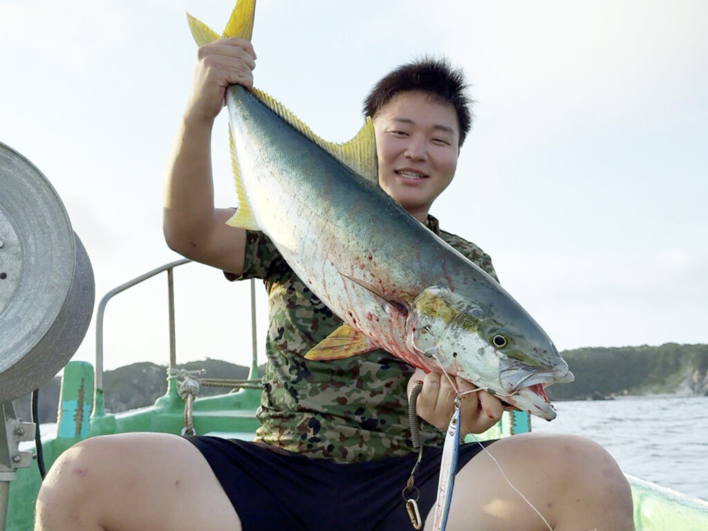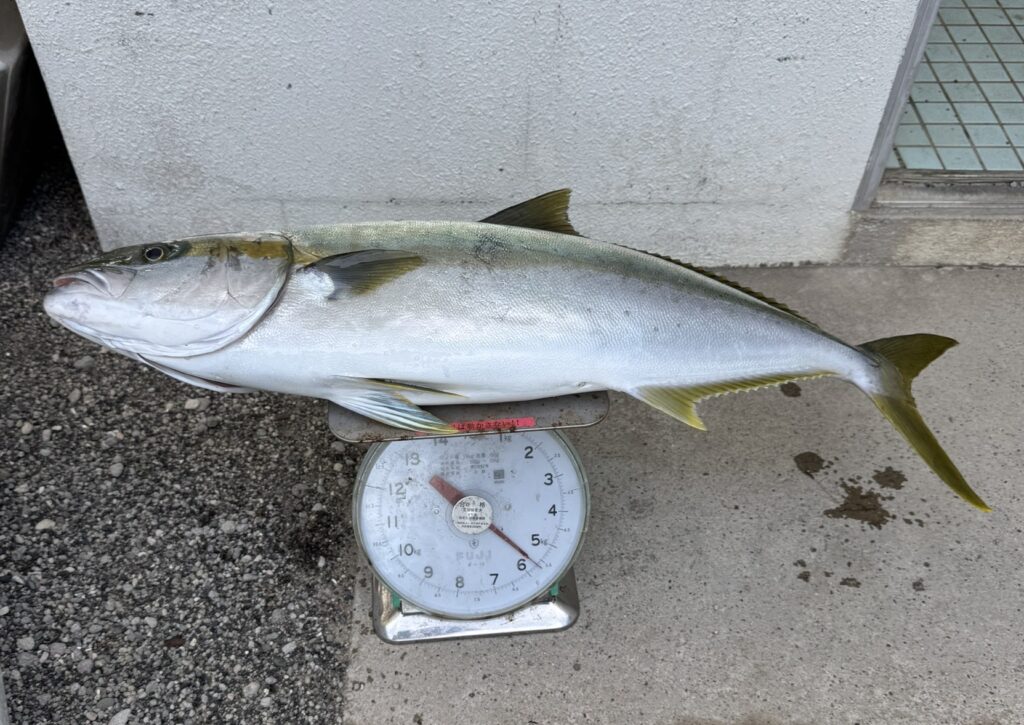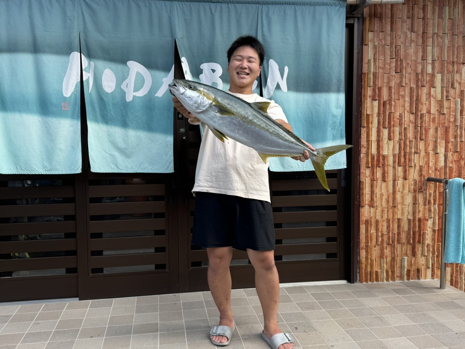 すっかり式根釣り名人になった、ひだぶん大学生バイトのヒデくんの今回の釣果はバエバエの夏マサ5.7kg です!