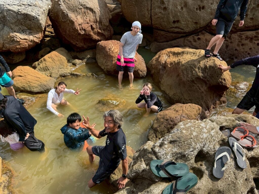 干潮時の石白川海岸は砂をほれば、あちこちから温泉が湧きだします。土嚢を使った本格的な自家製露天風呂が完成!