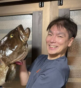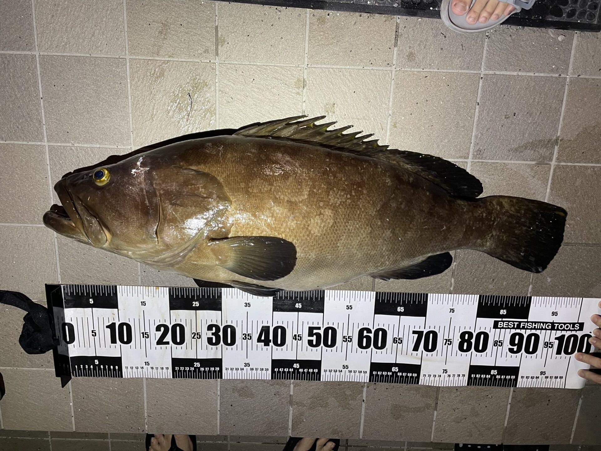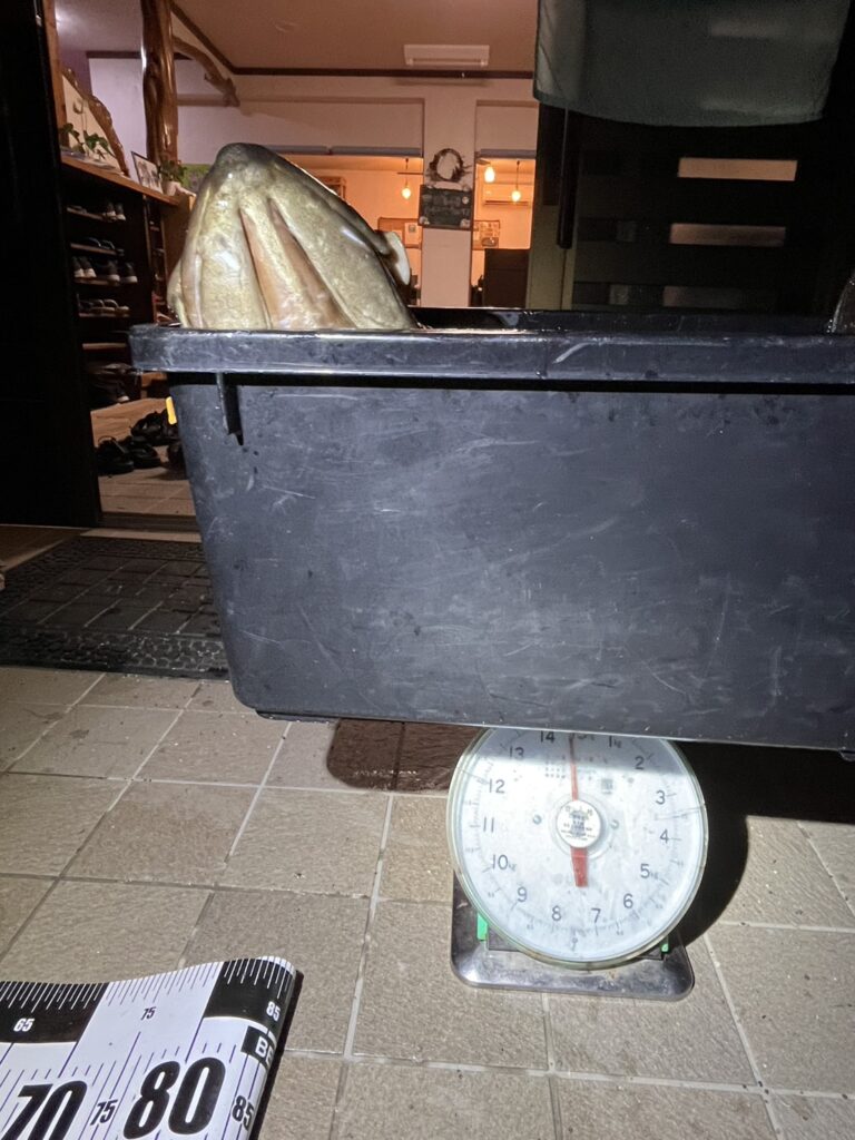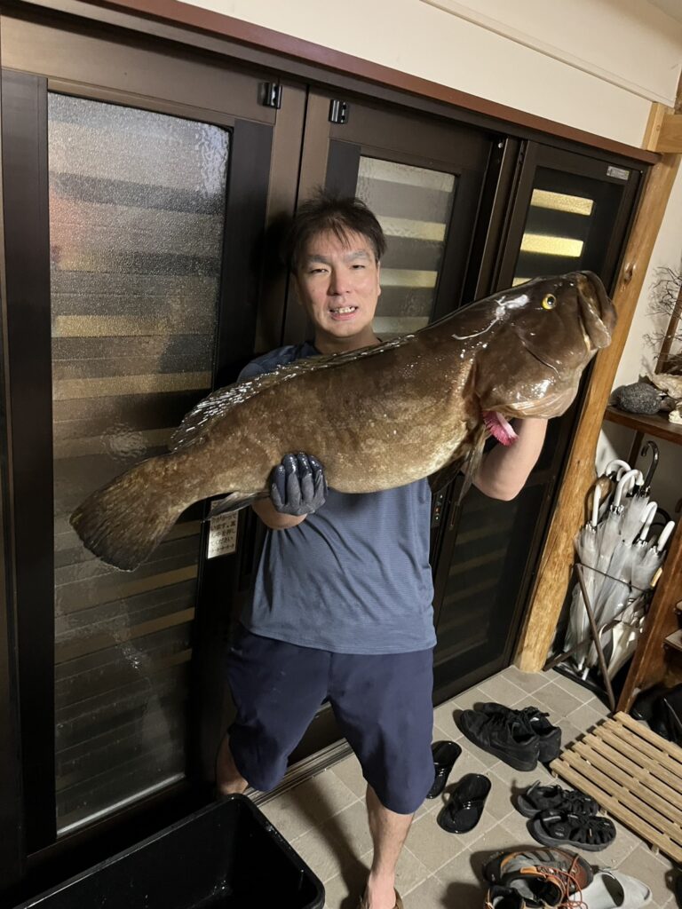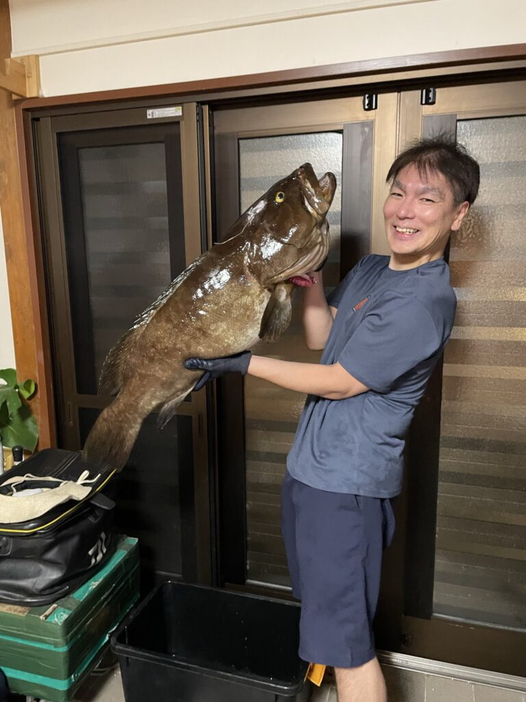 闘い疲れた1人のもり突き師が持ち帰ったのが、全長95㎝、重量14㎏の見事なクエでした。