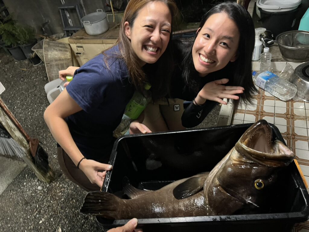見事、しとめた14㎏もの大きなクエと共に海面に浮上する時は、天にも昇る一瞬だったのではないでしょうか。