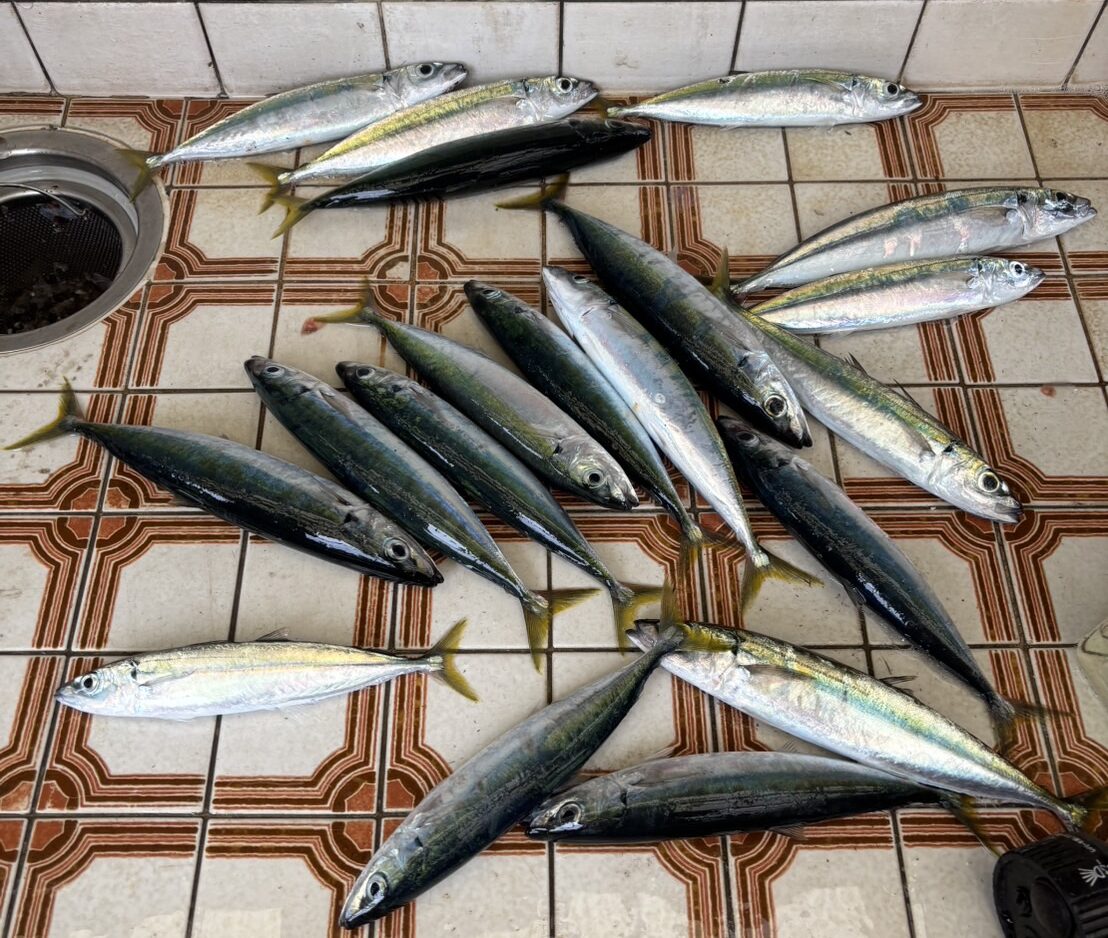 でも2匹いるから晩御飯のおかずはゲット、と絡まった糸をほどき、かごにアミ詰めて放り込んだら、また来た!えっ?こんなに簡単にかかっていいの?でまた1匹。隣の家族連れも、ムロアジが順調に上がってる。