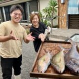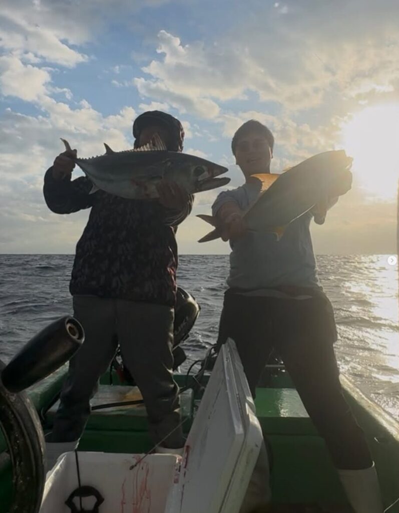 島を離れる最後の日も早朝からMさんにオフショアジギングに連れて行ってもらったヒデ君。釣果は3.3kgのカンパチをキャッチしてしばらくして、2.2kgのカンパチと丸々とした大きなハガツオのダブルヒット!
