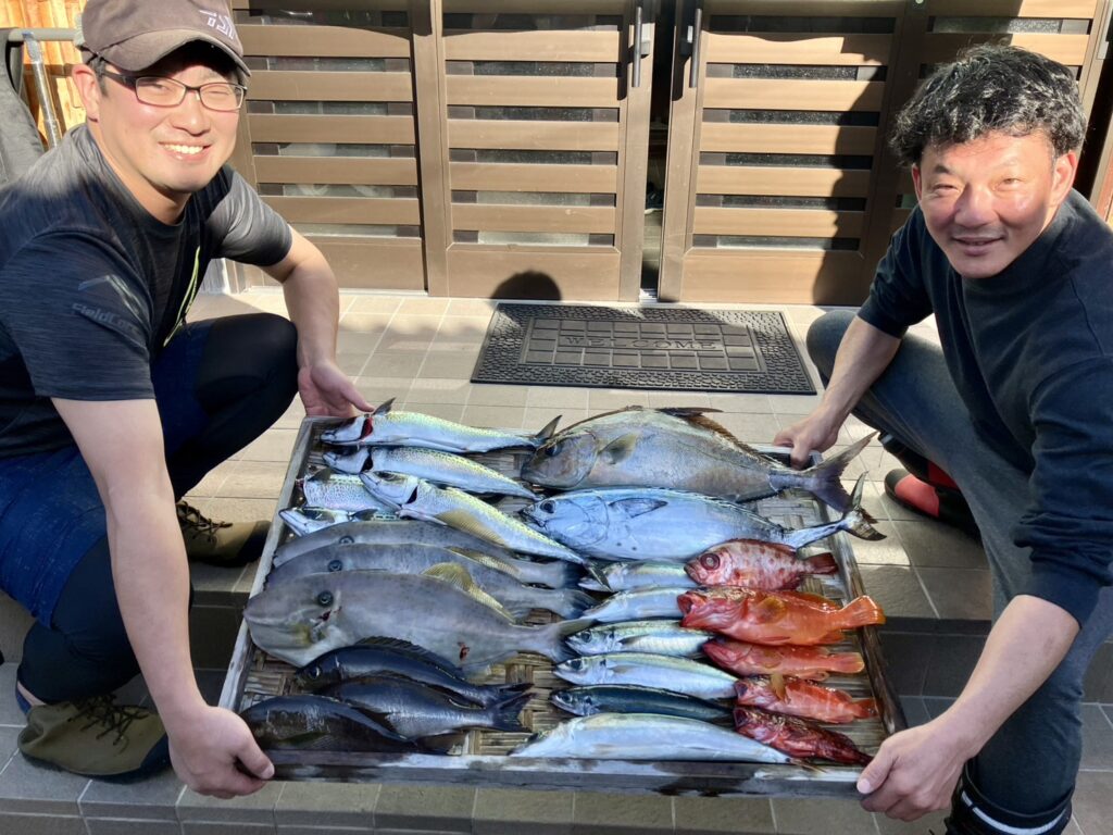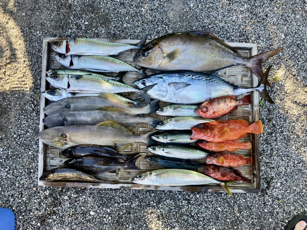 1泊の釣果はヒレナガカンパチ、スマ、ムロアジ、イサキ、ゴマサバ、アカハタ、カサゴ、ゴマヒレキントキ、ウスバハギ。