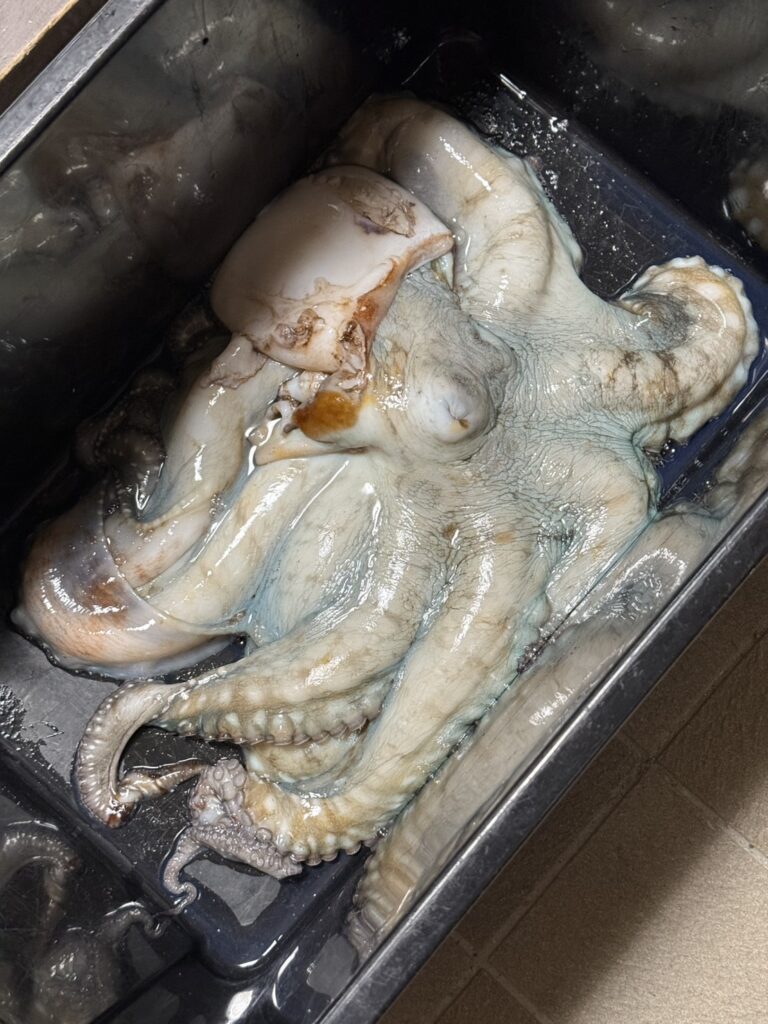 1日目は大きな真ダコをGETです。真ダコは足を入れて最大60㎝、約3㎏程度と言われていますが、それ以上あるような…?