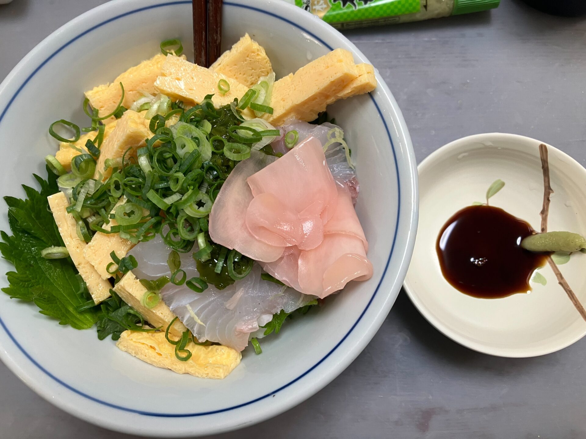 持ち帰った石鯛の一部は、大葉、厚焼き玉子、めかぶ、ネギ、式根島の島のり、ガリと一緒にチラシ寿司風海鮮丼になりました。回ってない寿司屋なら一貫1000円でも、おかしくない極上石鯛なので、当然、ヤバ旨です。