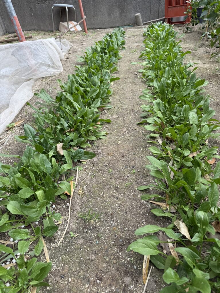 さやえんどうはこんなに大きくなりました。暖地ならではの秋まきで、お正月に充分間に合います。ほうれん草や大根も立派になってきました。おいしい冬野菜がたっぷり楽しめますね。