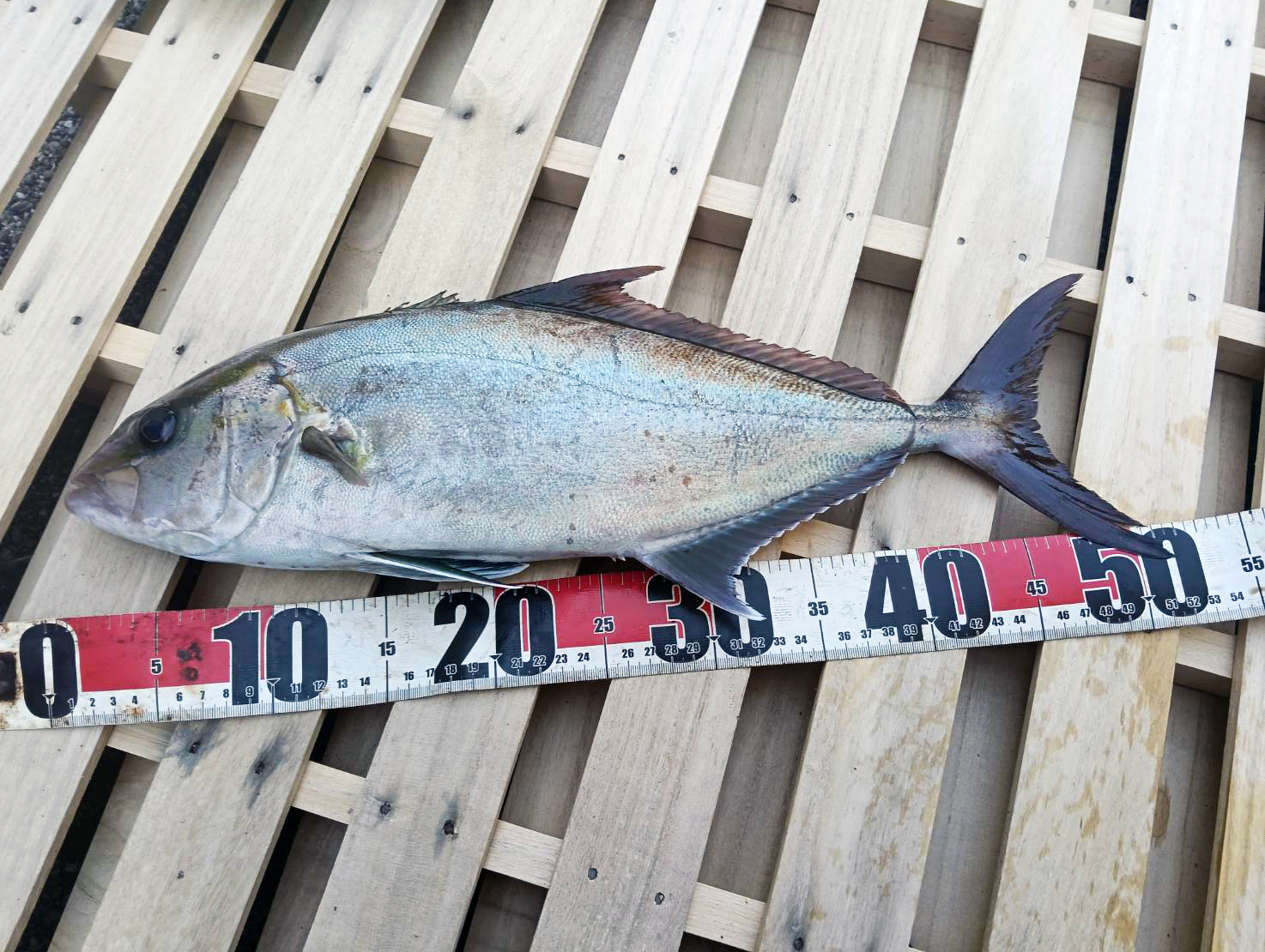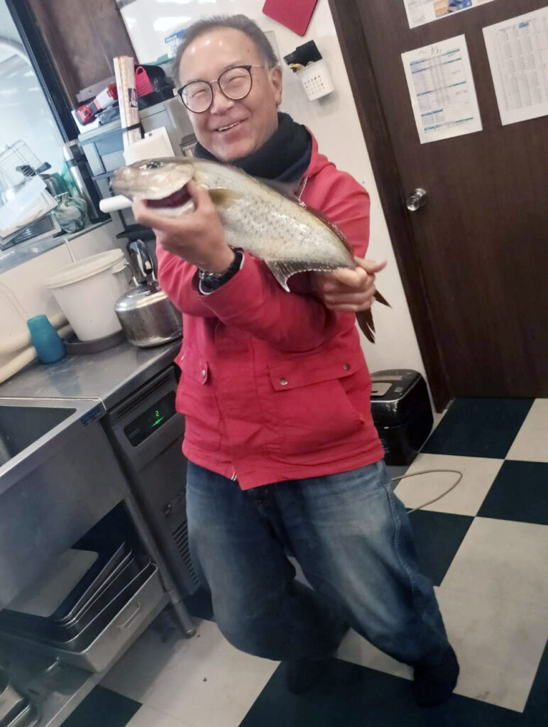 移住者Iさんの今朝の釣果です!毎朝まじめに出勤していた甲斐あって、桟橋のカゴ釣りで見事な本カンパチを仕留めました。