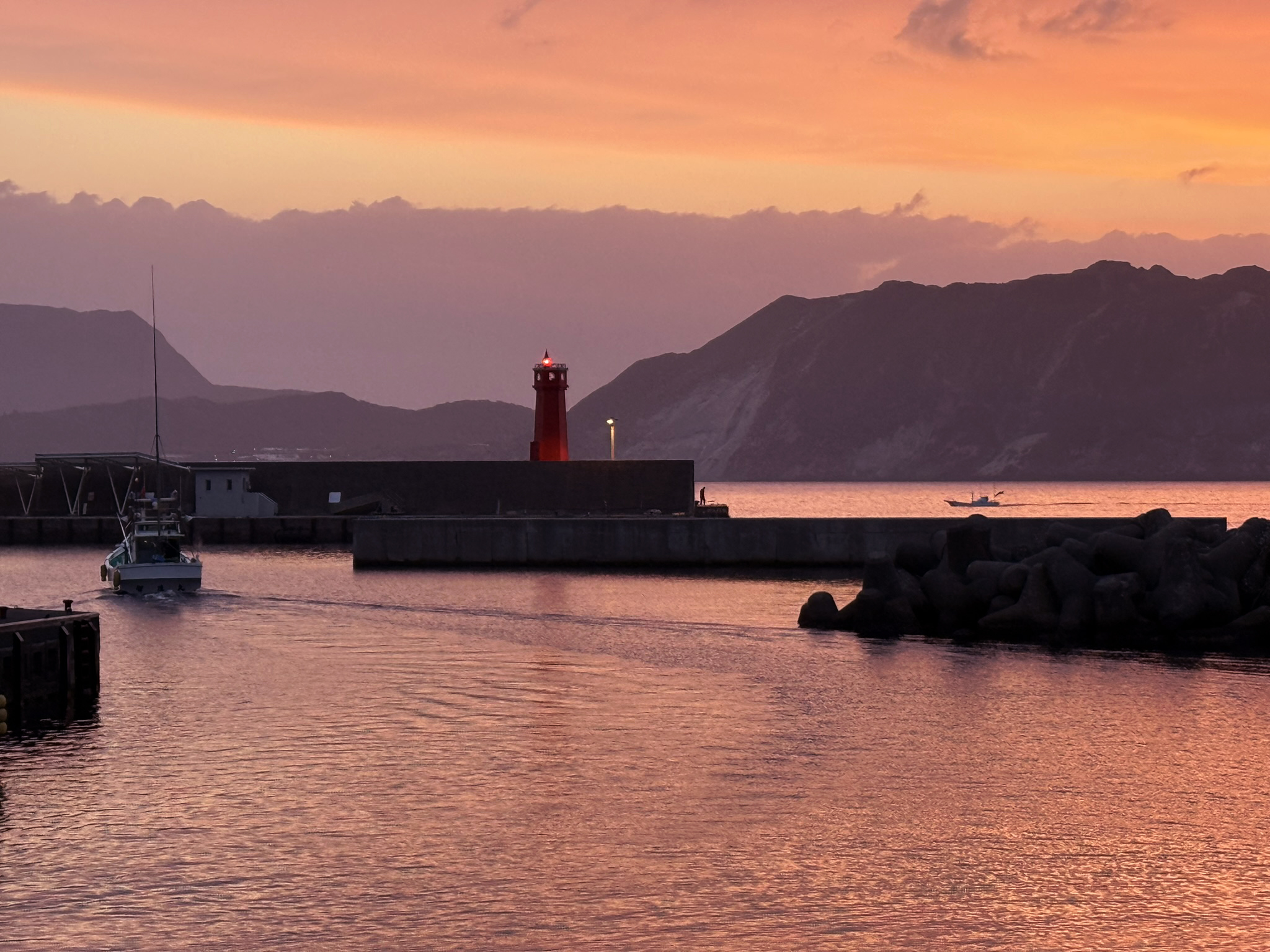 Iさんは式根島が気に入って移住し、気ままに大好きな釣りをする生活を満喫しています。こちらはバラ色の朝焼けに染まる野伏港です。