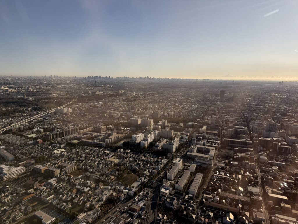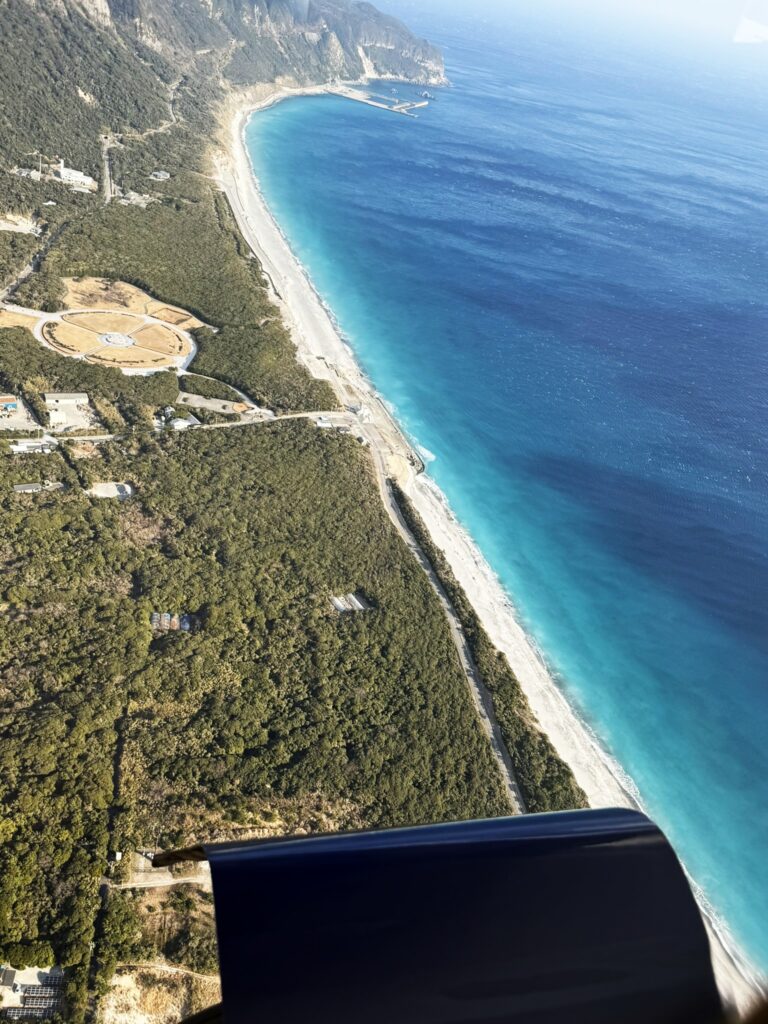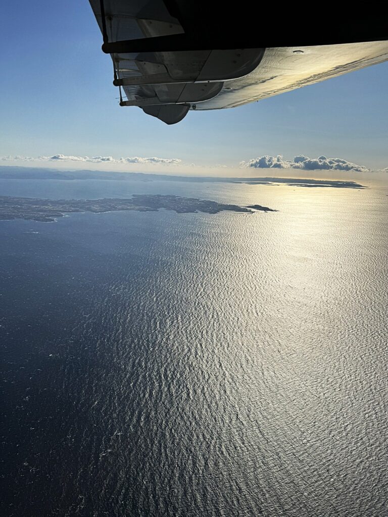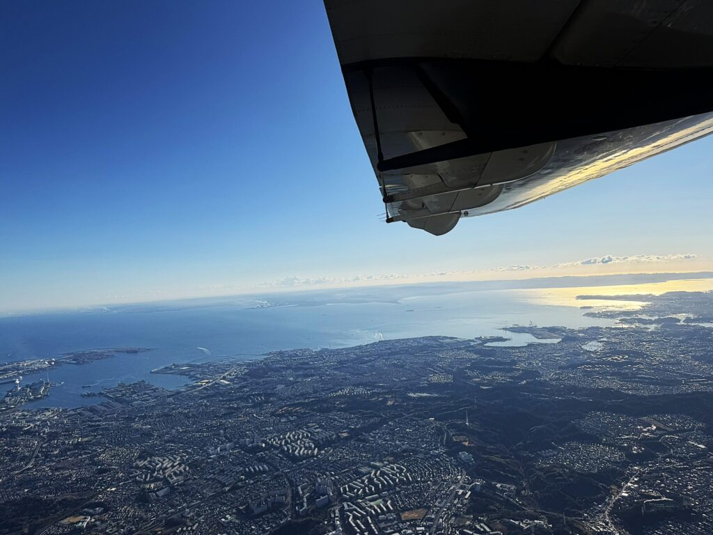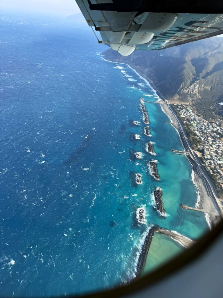 いよいよ、離陸となります。小型機ゆえに、航行高度が2000m前後と低いため、下界の景色がよく見えます。座席は自己申告した体重により、左右バランスよく振り分けられます。操縦席に向かって左側は各島、右側は富士山が見えます。