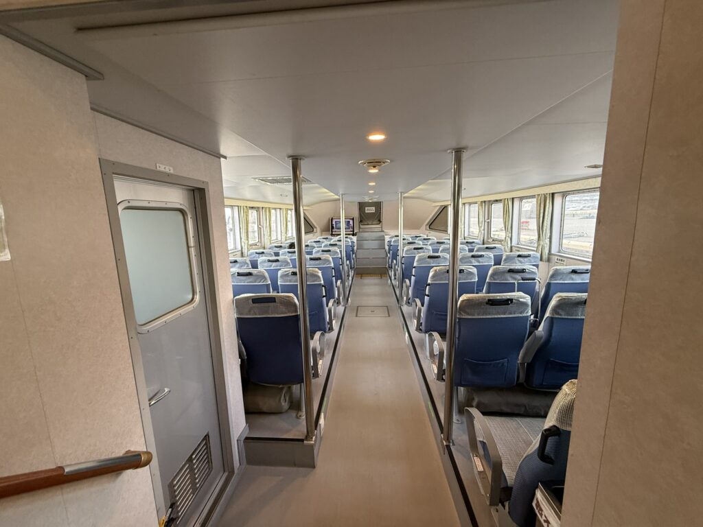 待合室から徒歩で機体へ向かい、タラップを登って搭乗します。
