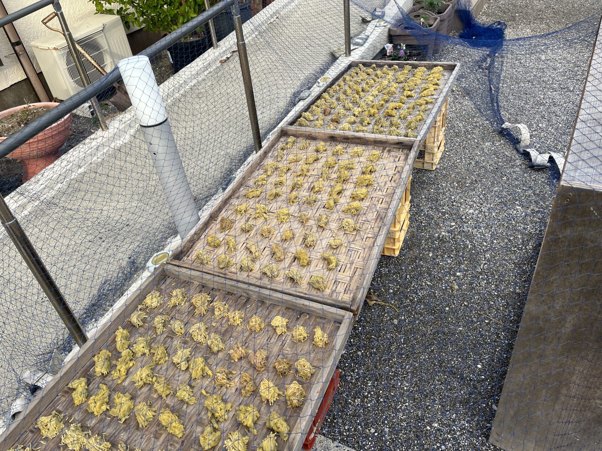 芋の皮をむいて煮てから、肉すり機でミンチにし、エンガと呼ばれる竹であんで木枠をつけたものに広げて干す。強い西ん風に2~3回晒し、カリカリに乾かす。正月に芋餅の材料として作る - 切り干し