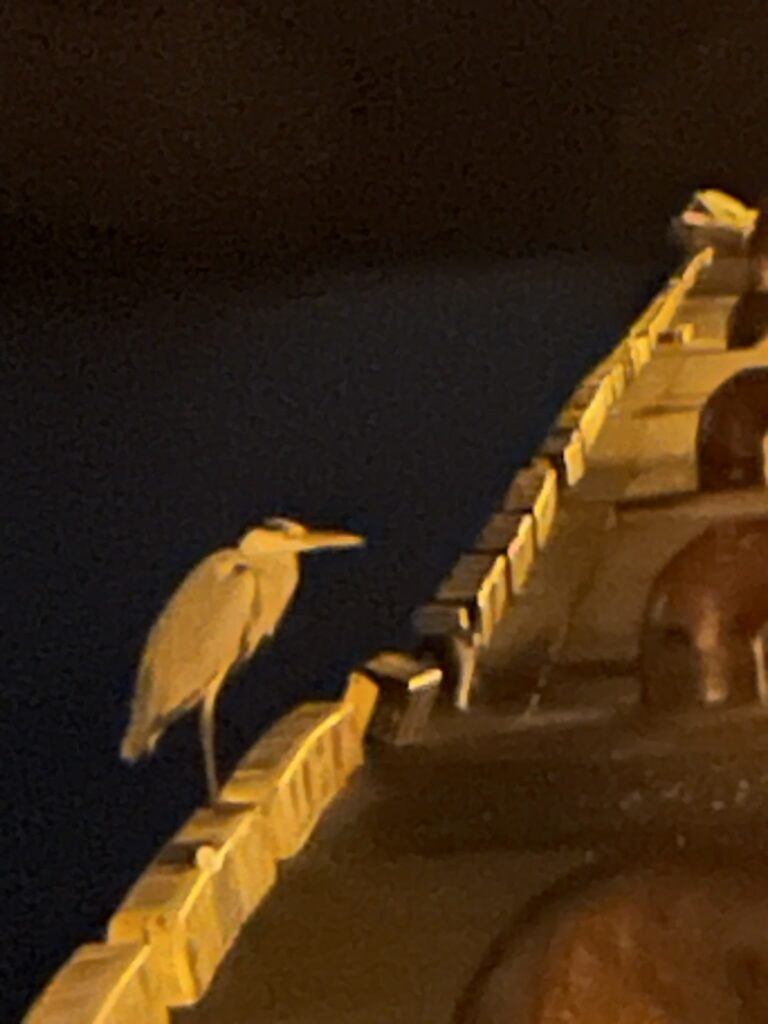アオサギは、同じく野伏港に居ついている常連釣り師たちに、「アオちゃん」と呼ばれ、程よいサイズの魚を投げてもらって可愛がられています。決して、自ら近寄ってきて釣り餌や獲物を漁ったりしません。