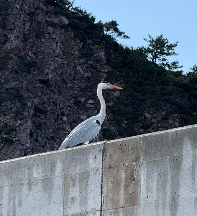 いつの頃からか、野伏港に居ついている一匹のアオサギがいます。アオサギはいつも、置物のように微動だにせず、まっすぐに式根の海を見つめています。