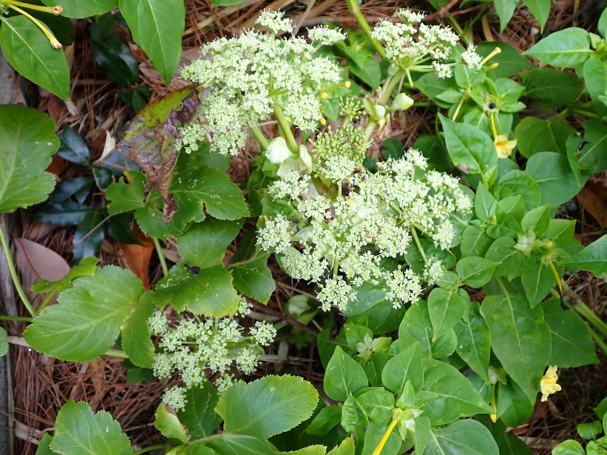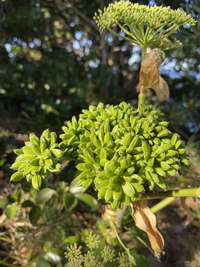 茎を折るとにじみ出る鮮やかな黄色の汁には、ポリフェノールの一種である「カルコン(キサントアンゲロール等)」が含まれており、これはシシウド属の中でもアシタバ特有の成分です。式根島では野生の個体が道沿いや山野に自生するほか、各家庭の庭先や畑で栽培され、島の食文化と健康を支える象徴的な植物となっています。