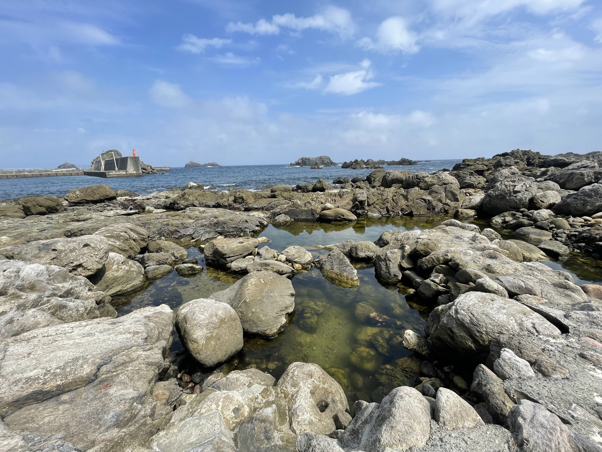 式根島港を臨む磯浜に湧く無色透明のナトリウム・塩化物強塩温泉。薄く緑がかり、湯壷の底から足元湧出を知らせる気泡が立ち上る。