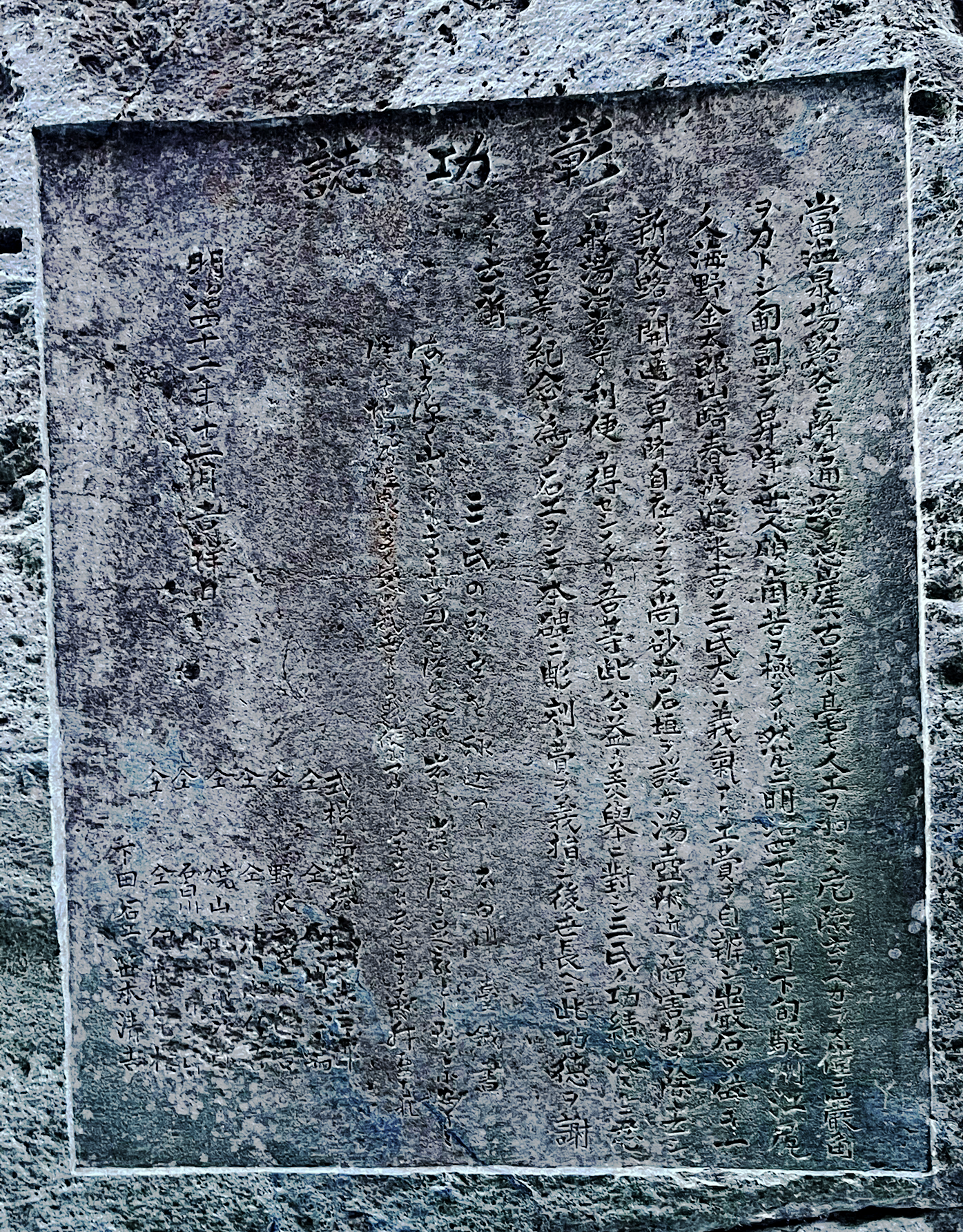 当温泉場渓谷二降ル通路ノ急崖ハ、古来毫も人工ヲ加へズ危険云フベカラズ。僅か巌角ヲカカト匍匐シテ昇降シ世人頗ル困苦ヲ極メタリ。然ルニ明治42年11月下旬、駿州江尻ノ人、海野金太郎、山崎春、渡辺米吉ノ三氏大イニ義気アリ、工費ヲ自弁シテ巌石ヲ砕キ新阪路ヲ開通シテ昇降自在タラシメ 尚砂防石垣ヲ設ケ湯壺付近ノ障害物ヲ除去シ一般湯治者等客ノ利便ヲ得セシメタリ。吾等此公益義挙に対シ、三氏ノ功績没スルニ忍ビズ吾等ハ記念ノ為ノ石工ヲシテ本碑ニ彫刻の費ヲ義援シ後世長ヘニ此功徳ヲ謝スト云爾