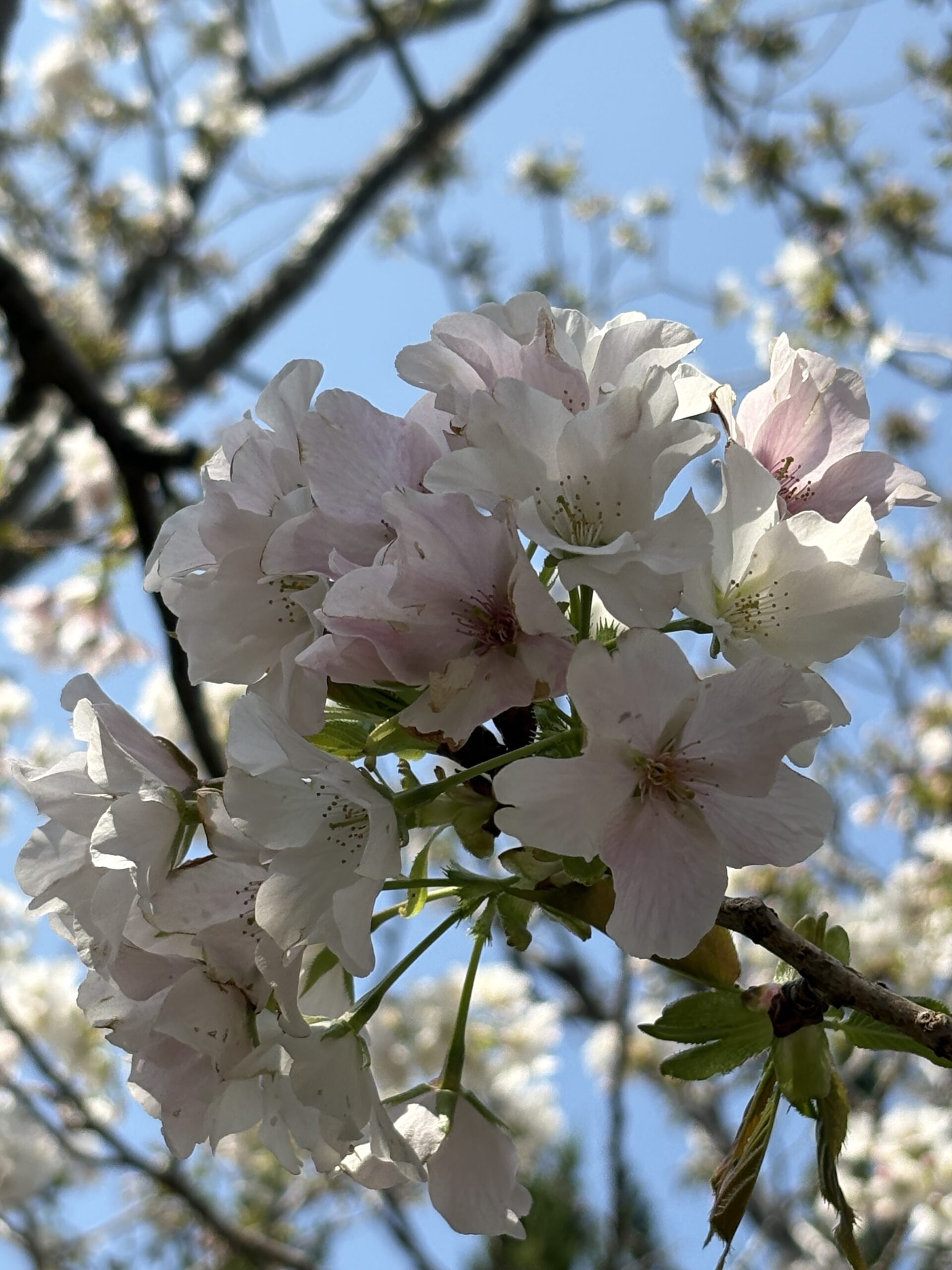 しかしオオシマザクラやヤマザクラなどの野生のサクラは、昆虫が花粉を媒介して実を結び種子で増えるため、遺伝的に多様です。同じ地域のオオシマザクラでも、早咲きのものもあれば遅咲きのものもあり、純白の花からほんのり薄紅色の花もあるのは、遺伝的に多様で個体差があるからです。オオシマザクラは初夏に大粒の黒い実、小さなサクランボを実らせます。この実の味にも個体差があって、苦くて不味いものもあれば、ダークチェリーと遜色ないくらい甘くて美味しいものもあります。