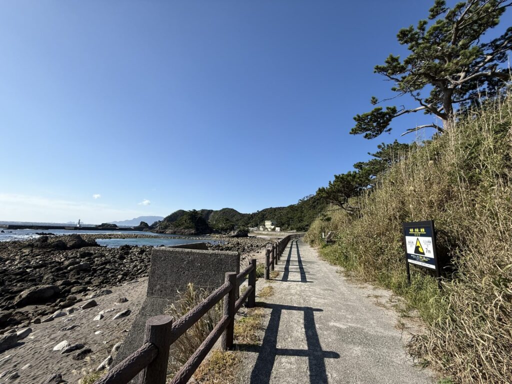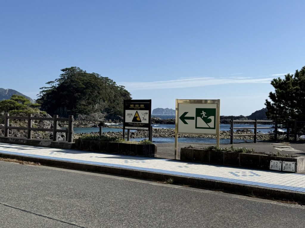 サーフィンポイントでもある釜の下海岸は幅が広く、海に向かって左右の両端で避難経路が分かれます。