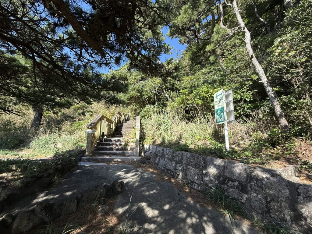 海岸からすぐ階段を上がって、標識に従って東要寺方面へ。墓地の横を通って高台に直通できます(車は通行不可)。