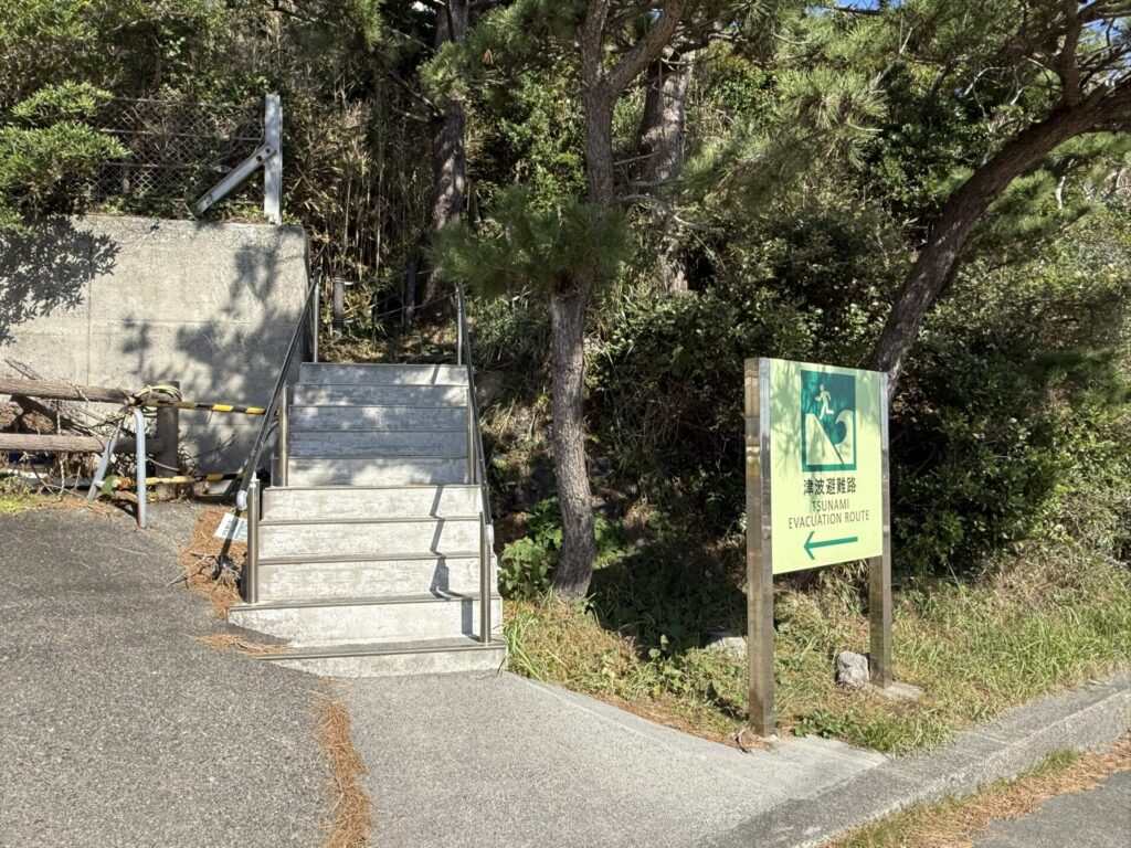 式根島は海岸から高台に抜ける階段や避難路が要所要所に用意されており、海抜の標識、避難路のマークなどが明示されています。海岸で過ごす時、意識して見ておきましょう。