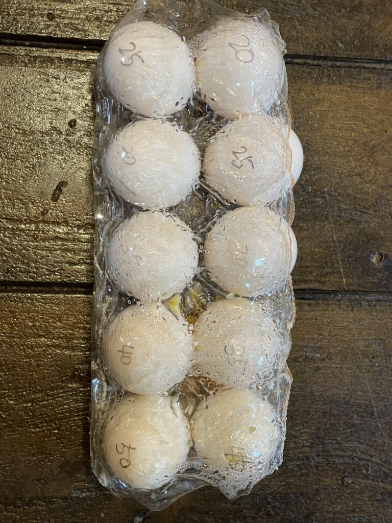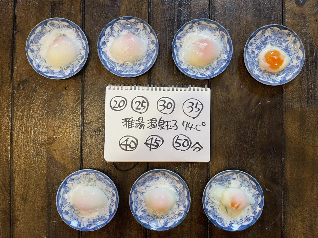 湯温をはかり、たまごを沈めて20分後から50分後まで5分おきにたまごを取り出し、持ち帰って固まり具合調べる