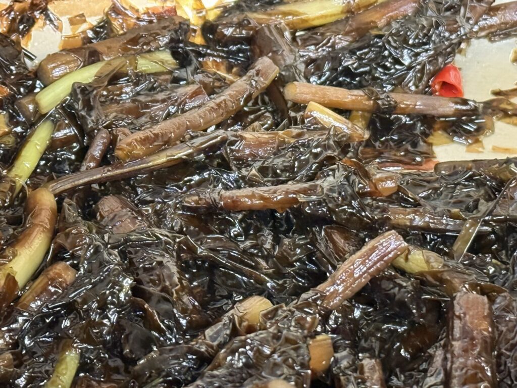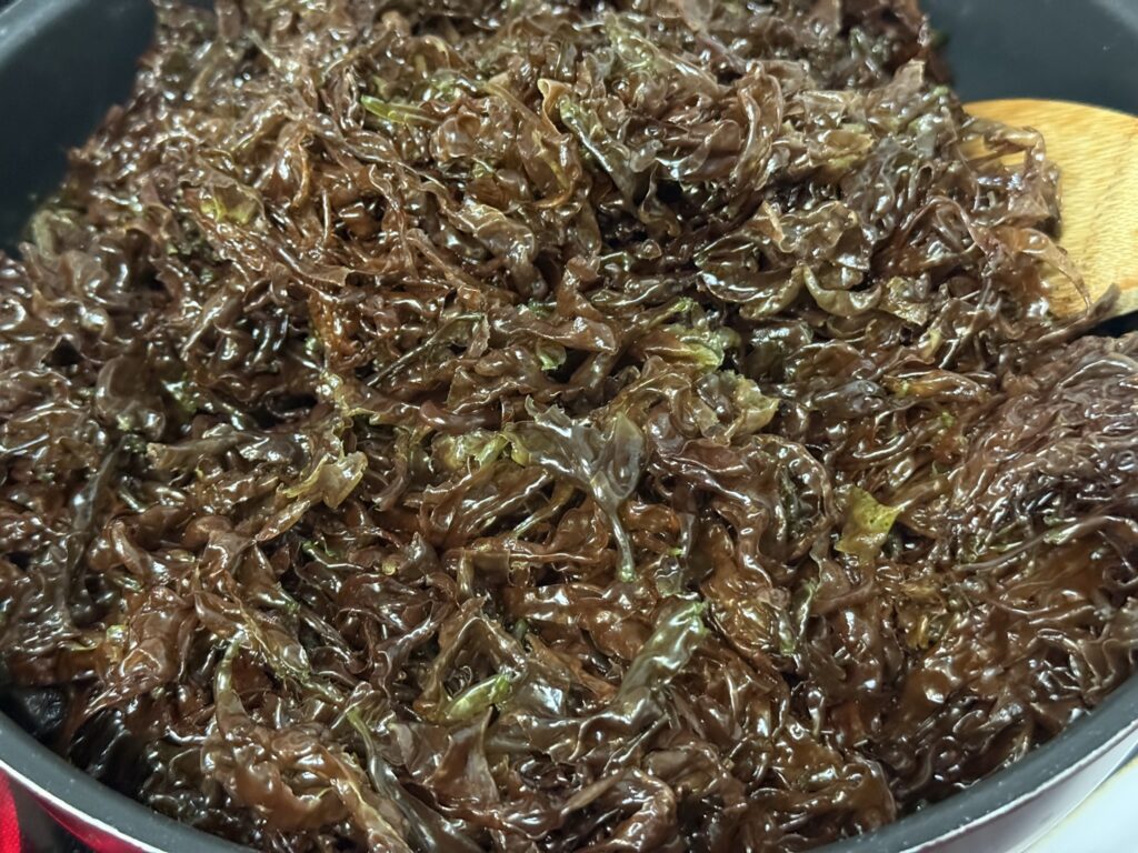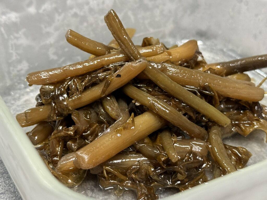 それでは、式根島の島民がこよなく愛する「ふきんとうと海苔の炒め煮」を作ります。海苔はハバノリでも岩のりでも良く、乾海苔を戻して使っても構いません。甘辛いきんぴらのような要領で作ります。海苔がよく煮汁を含むので、やや薄味で作るとよいでしょう。太く柔らかで、コクがあるふきんとうのもちもちとした食感と磯の香りの海苔がよく合って、記憶に残る美味しさです。