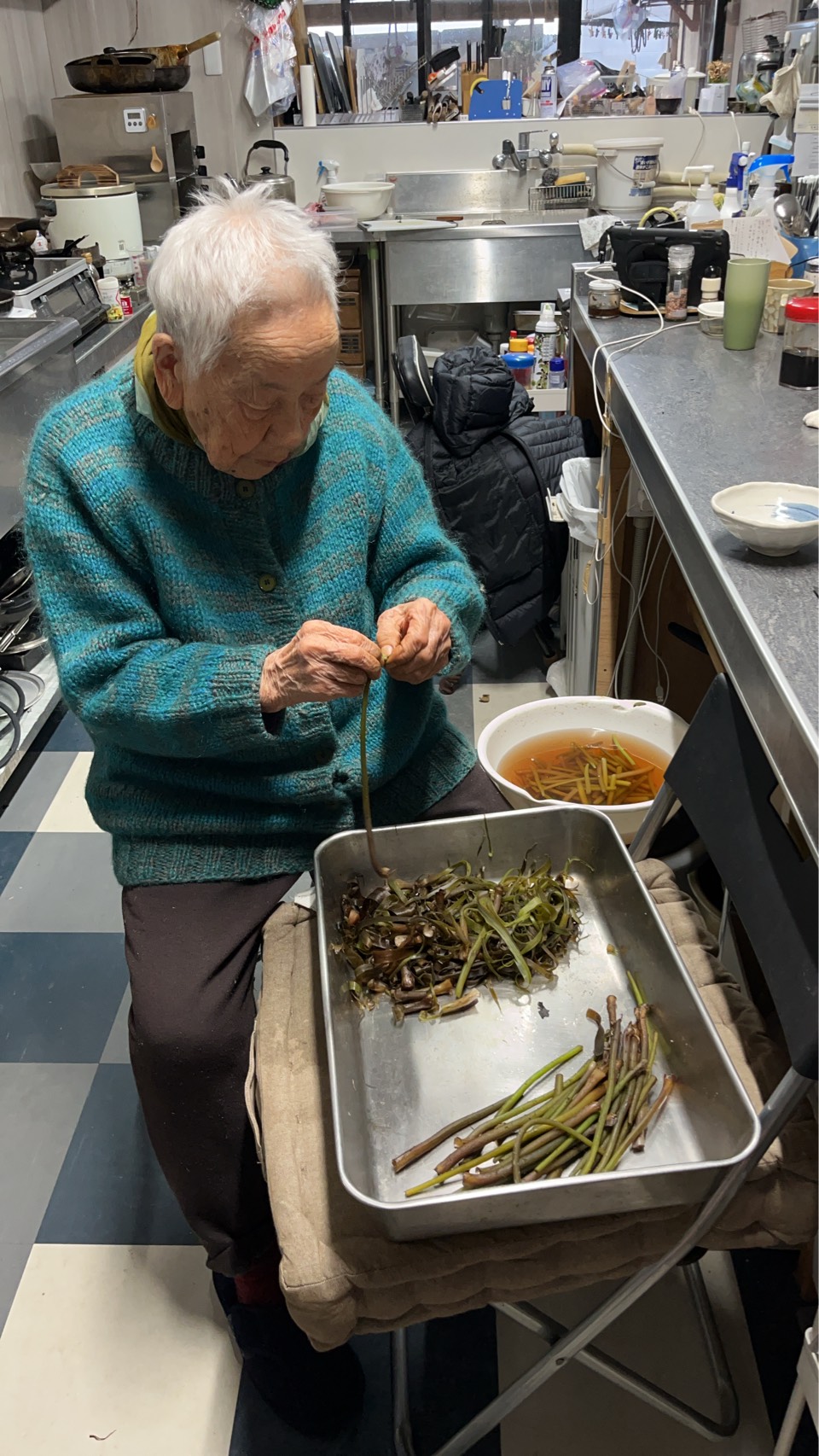 写真は、式根島在住最長老の95歳のバァが、長年の要領でふきんとうの皮むきをしているところです。