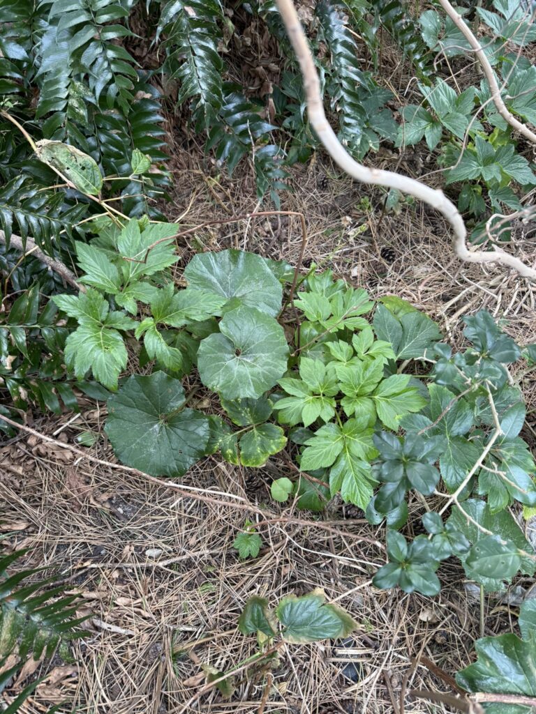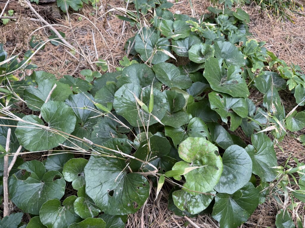 ツワブキは直射日光を嫌いますので、木漏れ日が注ぐような林の半日陰でよく育ちます。式根島では、ちょうど明日葉と同じ環境になるので、混じって生えていることが多いです。