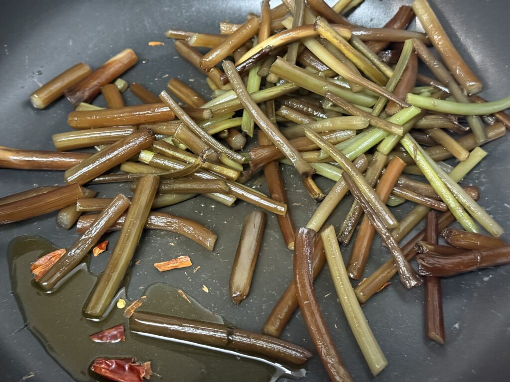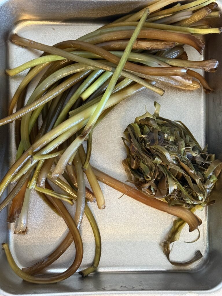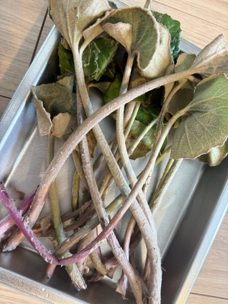 皮をむいて、と簡単に書きましたが、なかなか、ちまちまとした手仕事です。また、アクで指先が黒くなるので手袋推奨です。「良いのがいっぱいあった!」と大量に持ち帰ると、骨が折れる作業になるので要注意です。