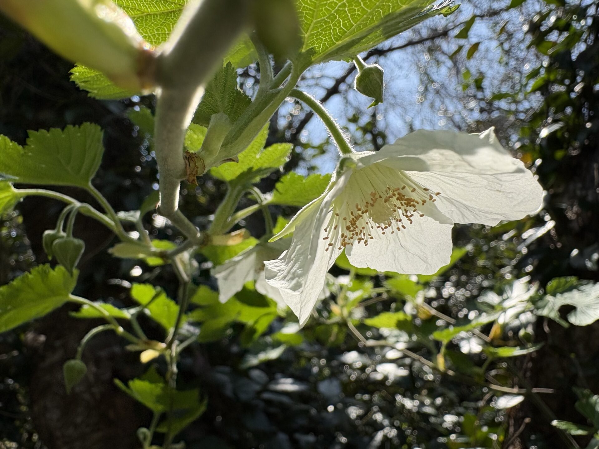 ハチジョウイチゴは掌状の葉・白い花・オレンジ色の実で、カジイチゴととても似ています。けれども式根島の南側の道沿いでは、ハチジョウイチゴの方が多いようです。決め手となる違いは、葉柄や花柄、葉の裏の葉脈の白い毛です。またハチジョウイチゴはカジイチゴよりも葉は小さめで優しい雰囲気、そして花は下を向いています(カジイチゴの花は上を向く)。