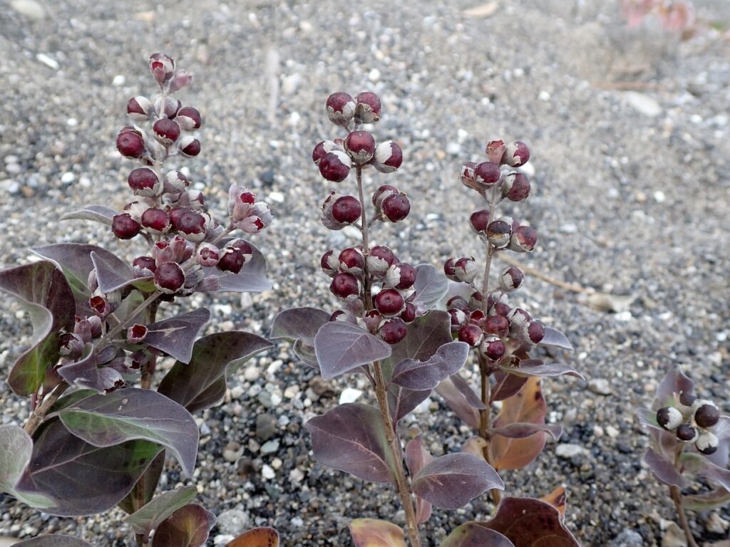 夏の盛り、式根島の白い砂浜に美しい紫色の花を咲かせる常緑の落葉低木です。「浜這(はまはい)」から転じた名前の通り、砂の上を這うように茎を伸ばし、砂を繋ぎ止めて海岸線を守る重要な役割を果たす海浜植物です。全体に爽やかな芳香があり、昔の人はタンスに枝を入れて衣類に香りを移したり、乾燥した実を枕の中に詰めてリラックス、安眠対策に役立ててきました。また、漢方の世界では乾燥した実は「蔓荊子(まんけいし)」という、熱を下げたり痛みを和らげたりする薬の原料です。