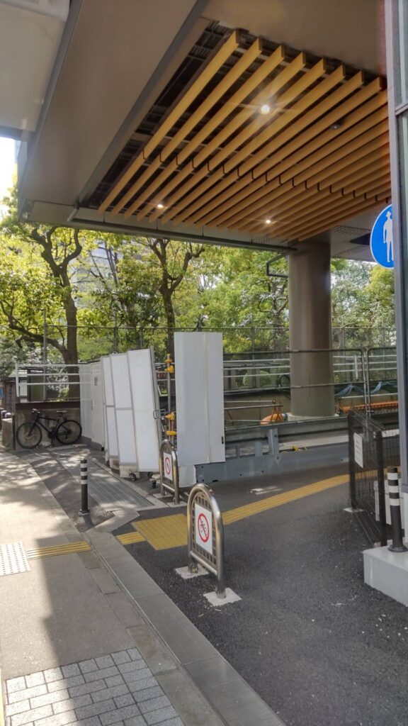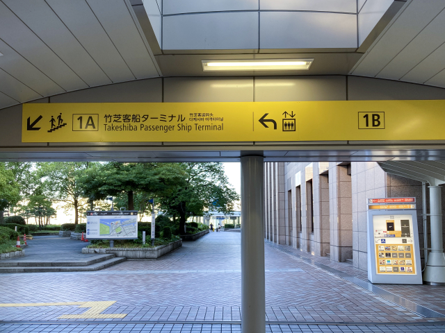 [階段]1A出口階段を下りたら、喫煙所付近に出ますが、そのすぐ先が竹芝客船ターミナル入口です。