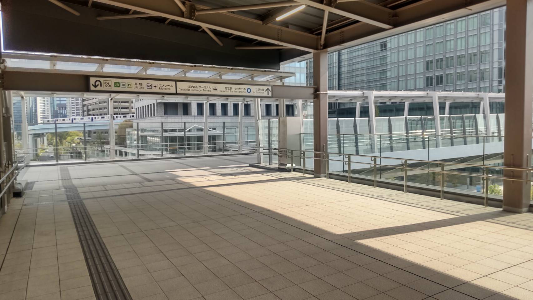 JR浜松町駅北口から屋根付きの歩行者デッキを使って、徒歩8~10分程度で竹芝駅まで歩けます。