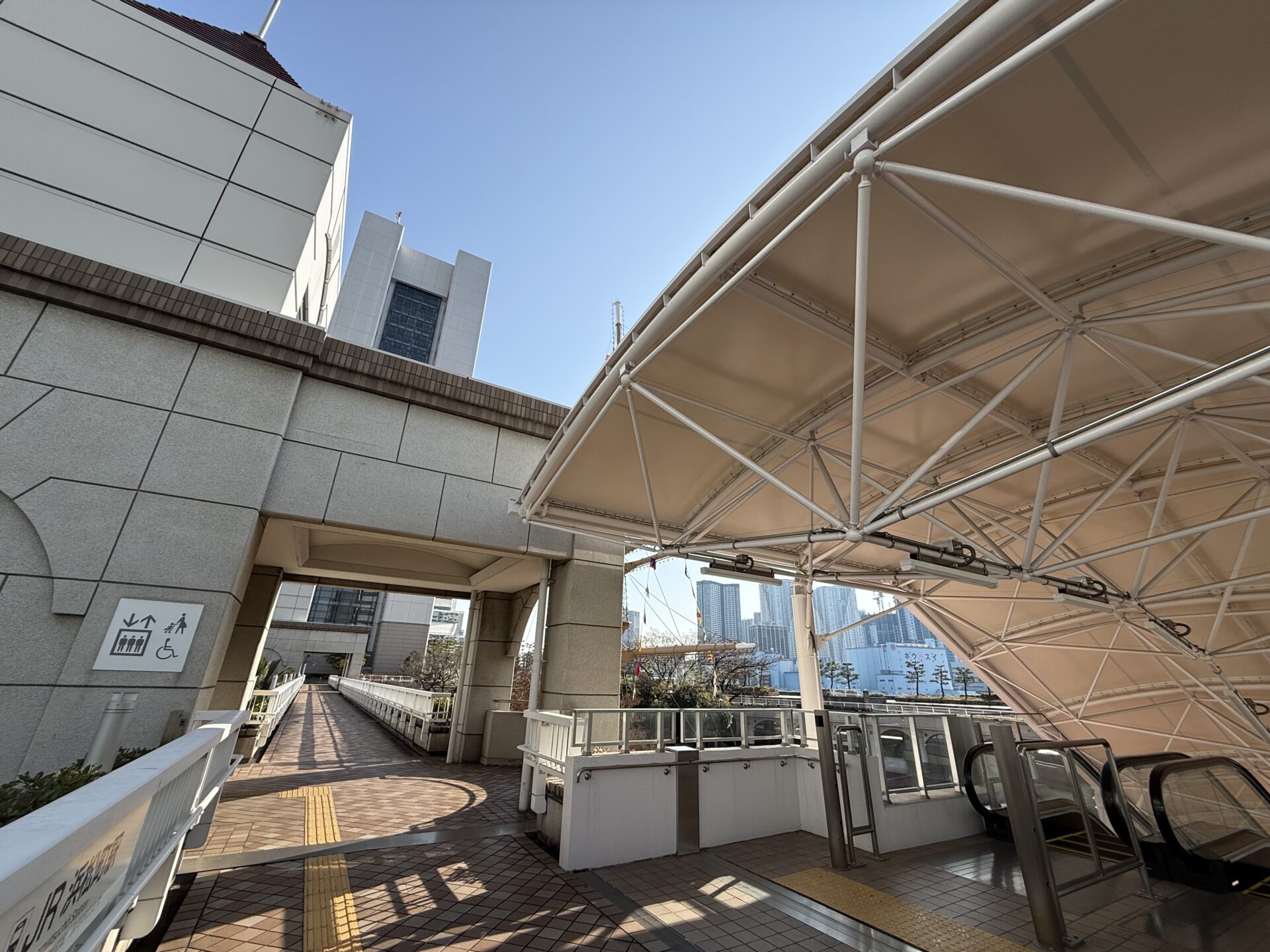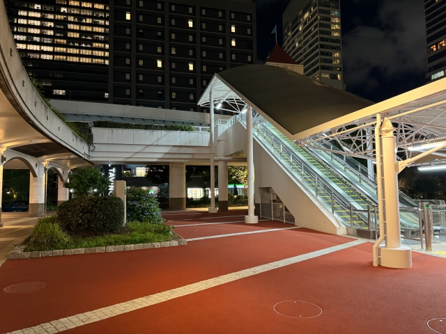 [エスカレーター]1B出口を出て、ポートデッキを少し進むとエスカレーターがあり、中庭から竹芝客船ターミナル入口に入ります