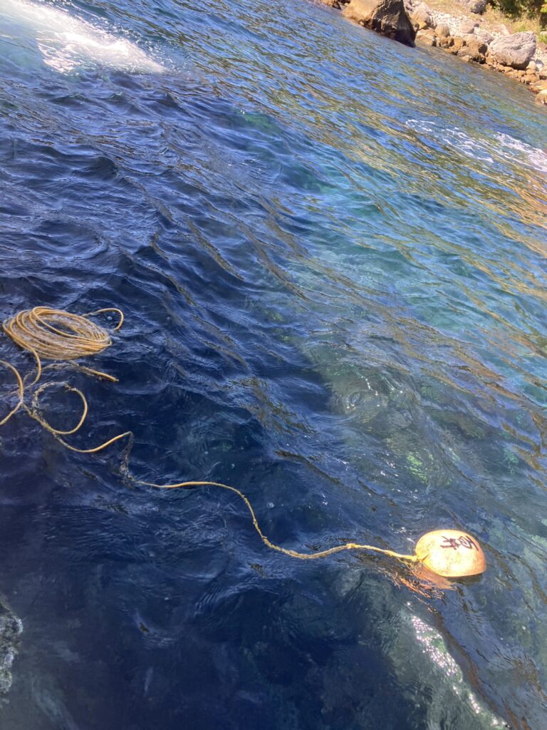 エビ網は、磯やテトラポット、伊勢海老の住処の穴がある堤防の際に沈めます。式根島では、どの漁師がどの漁場に網を置くかは、くじ引きで公平に決めるしきたりです。