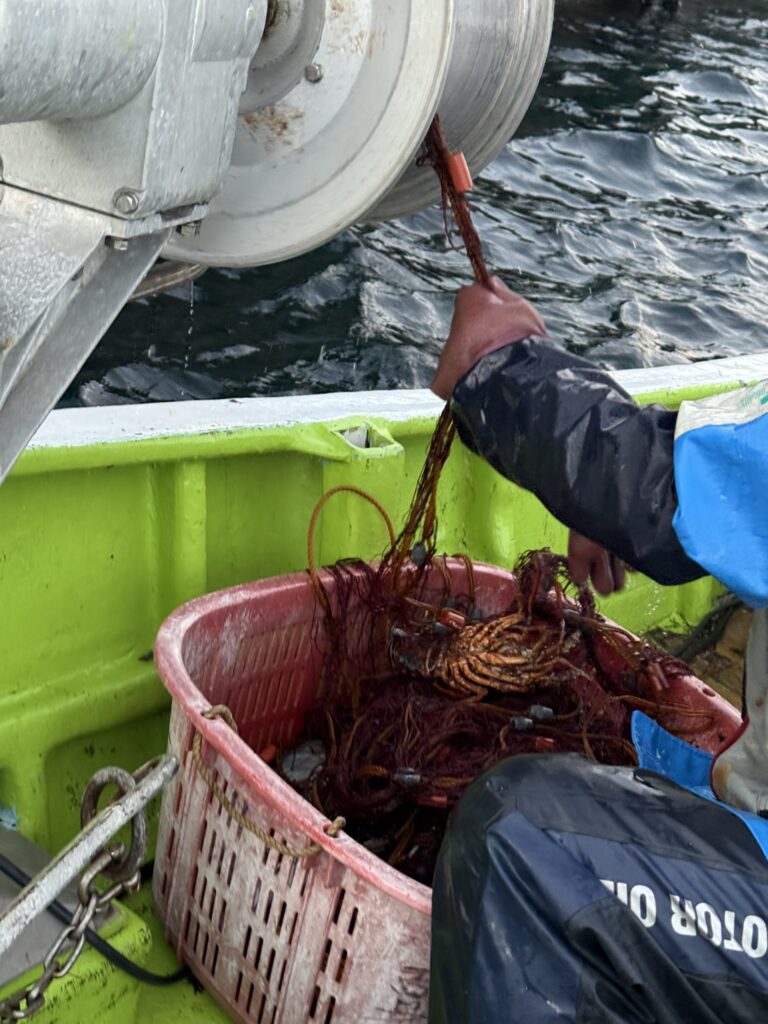 暗いうちから船に乗り込み、昨日仕掛けたエビ網の引き上げに向かいます。