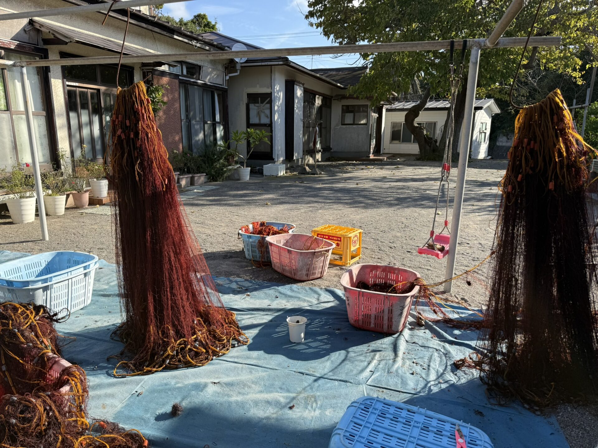 そして、漁協から戻ったら、刺し網に開いた穴や破れを補修し、再び網を掛けに行きます。
