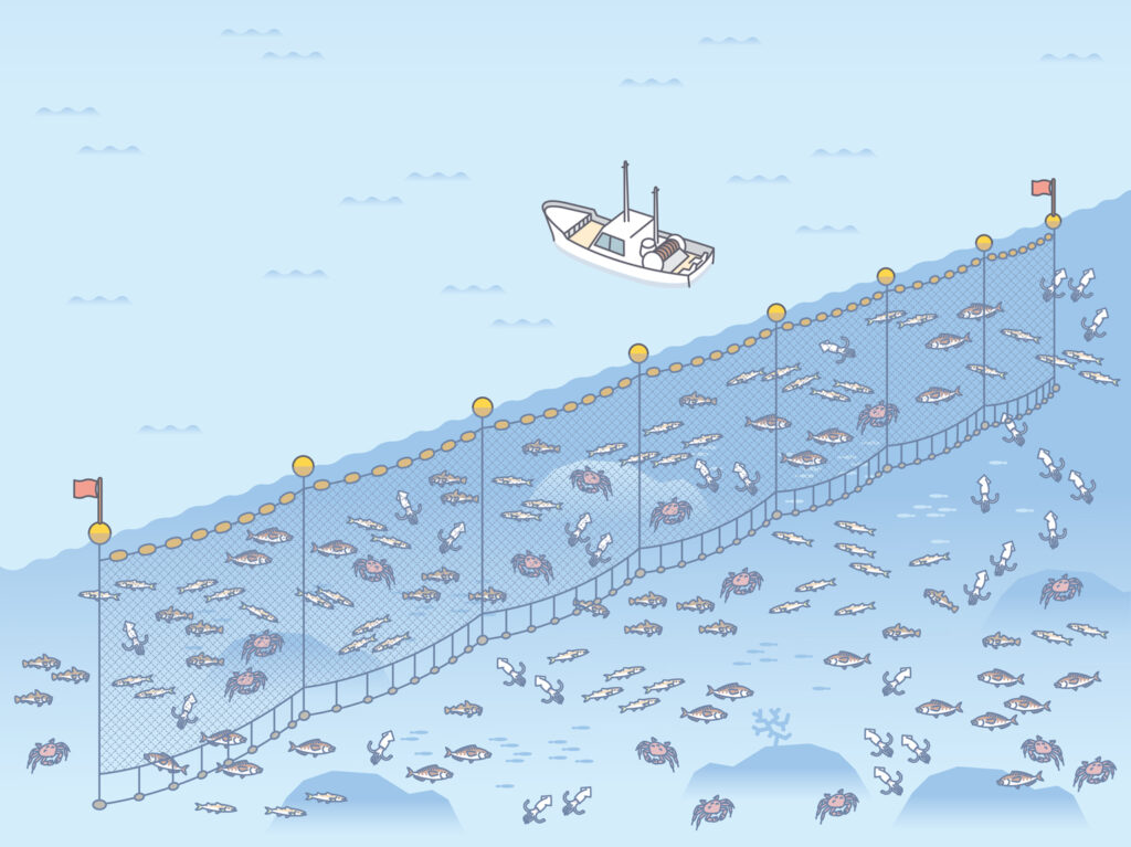 伊勢海老の漁は刺し網漁で行います。刺し網漁とは、横に長い網を海中に壁のように張り、獲物が網にからまる(刺さる)ことで捕獲する漁法です。漁師は、伊勢海老が日中隠れている磯やテトラまわり、桟橋付近を選び、海底まで網を落として垂直に設置していきます。