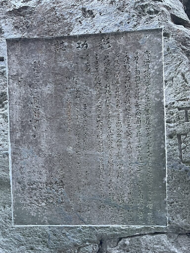 以前は、大変険しい危険な道でしたが、明治41年(1908) 泊浦の築港工事に来島した静岡県江尻の石工3人が、自力で道を作り付近を整備しました。この「彰功誌」が西側の壁に刻まれています。
