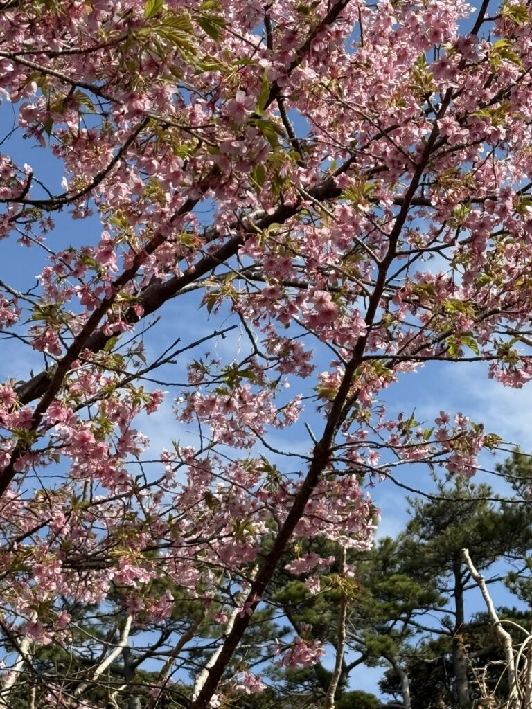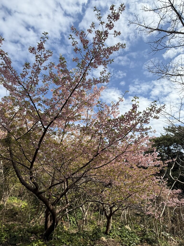 カワヅザクラ(河津桜)は暖地・式根島では1月中旬から咲き出す濃いピンクの早咲き桜です。静岡県河津町で1955年頃に発見され、オオシマザクラ系とカンヒザクラ系の自然交配種と推定されています。約1ヶ月かけて満開になるため、長い期間お花見が楽しめます。