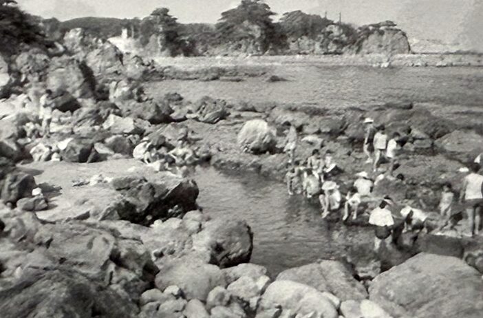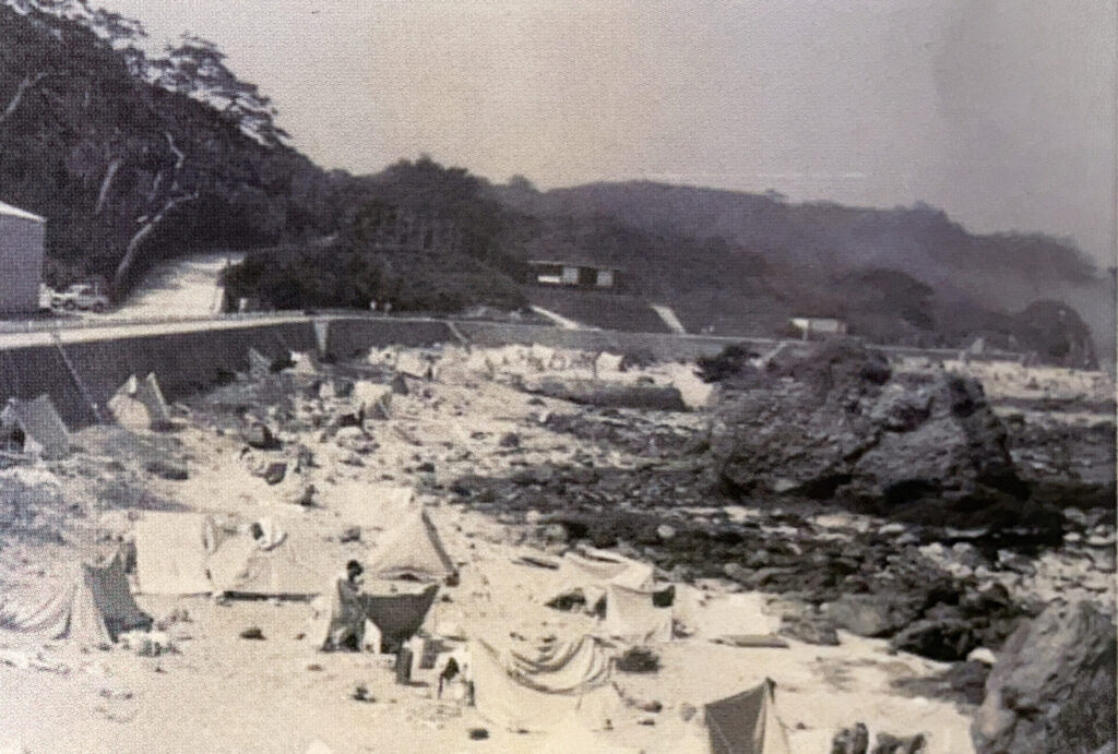 私が3〜5歳の物心ついたころ、夏になると石白と釜の下の海岸いっぱいに黄色と赤のテントが張り巡らされました。今思うと大学生くらいのお兄さんお姉さんだったようでした。