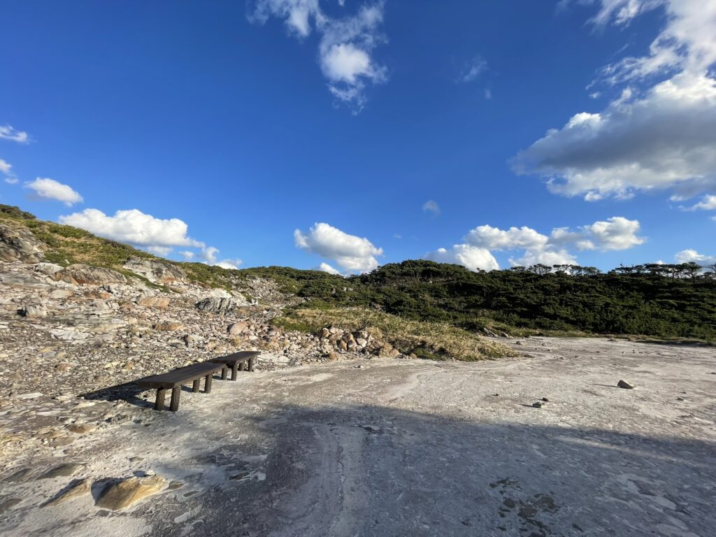 唐人津城同様、古い火口跡の景勝地。隈の井(くまのい)の地名は、雨が降るとすり鉢状の火口跡が水を集め、「幻の池」が出現することから。広々とした砂漠上の大地には、ベンチが点在し、休憩にちょうど良い。崖側は強風が吹き抜け、崩れやすい。柵がないので注意。