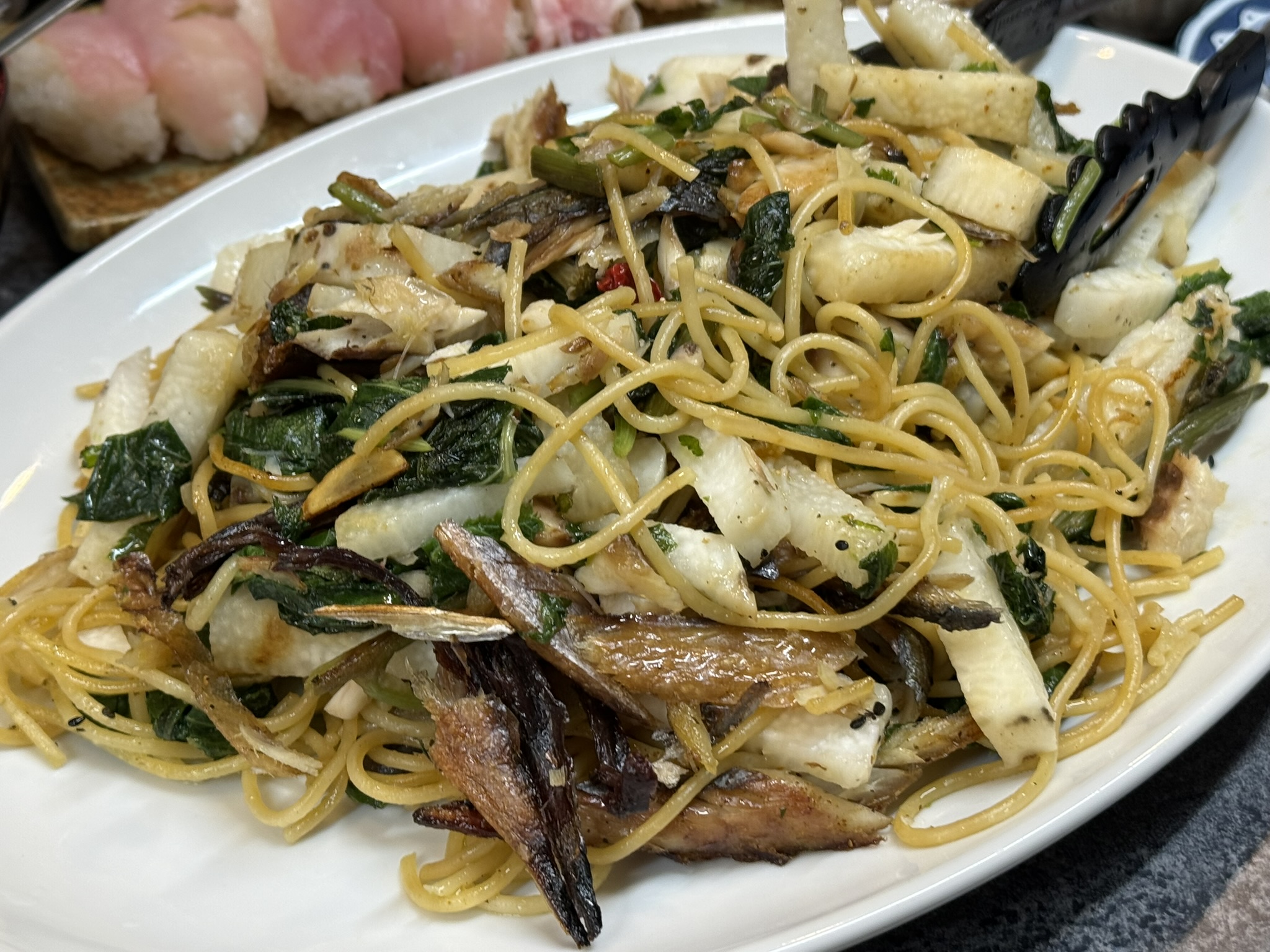 くさやはアンチョビのようなものですから、パスタやピザにもアレンジできます。こちらは、明日葉とくさや、アクセントに長芋を入れて作ったペペロンチーノです。