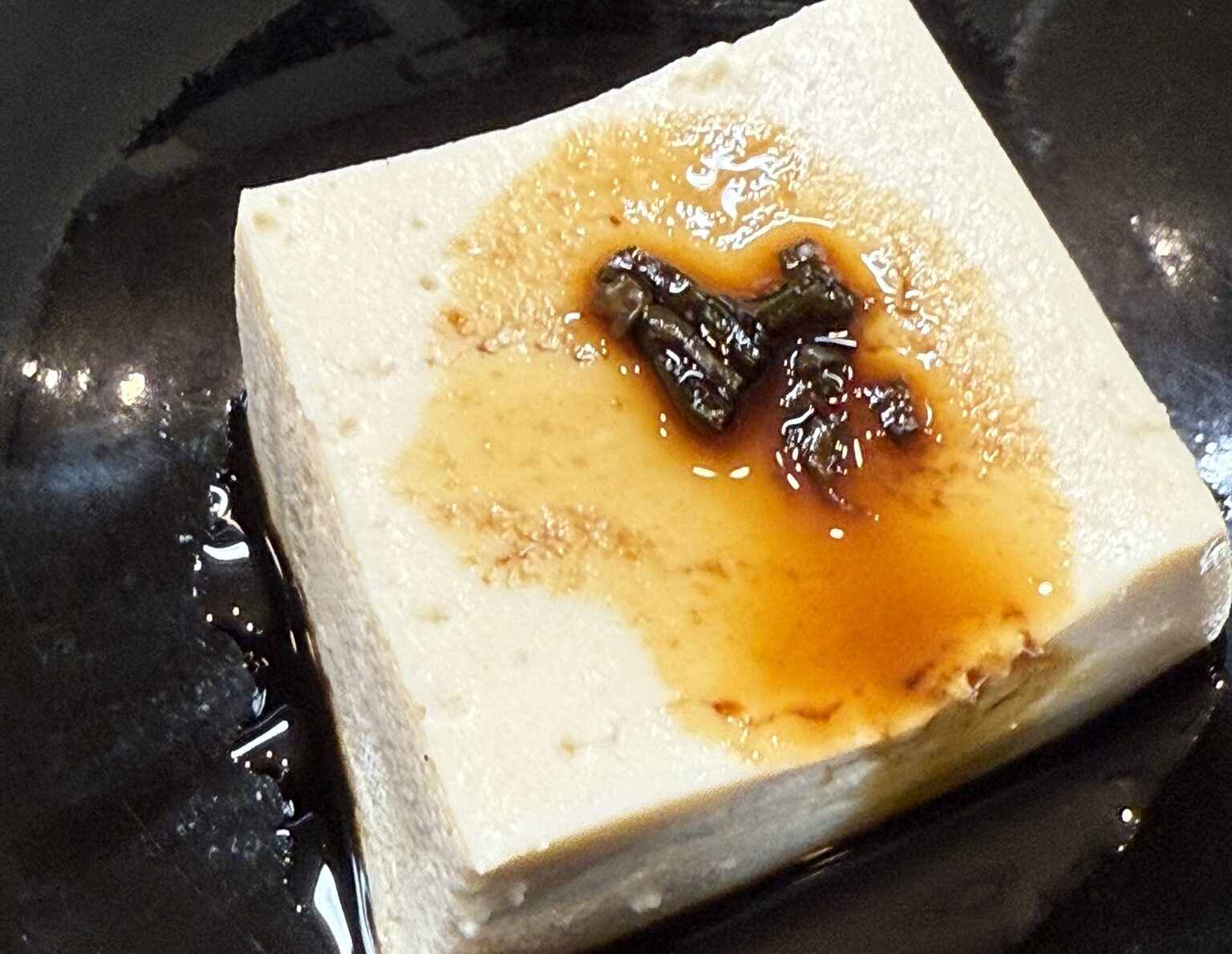 くさやを漬けた汁はしょっつるやナンプラーに近い風味です。こちらをほんの数滴と醤油と合わせて島唐辛子を入れたタレを温やっこにかけました。