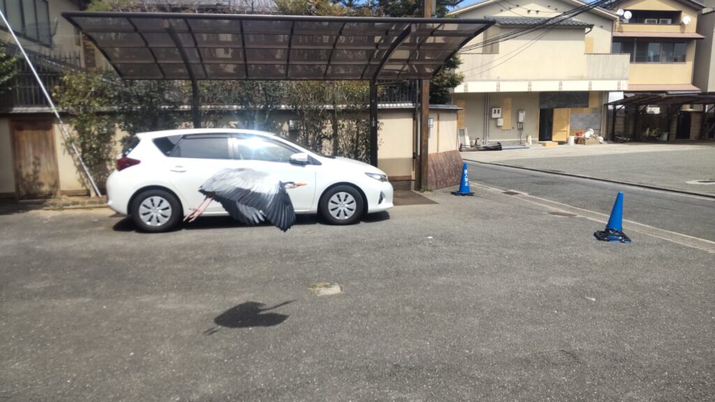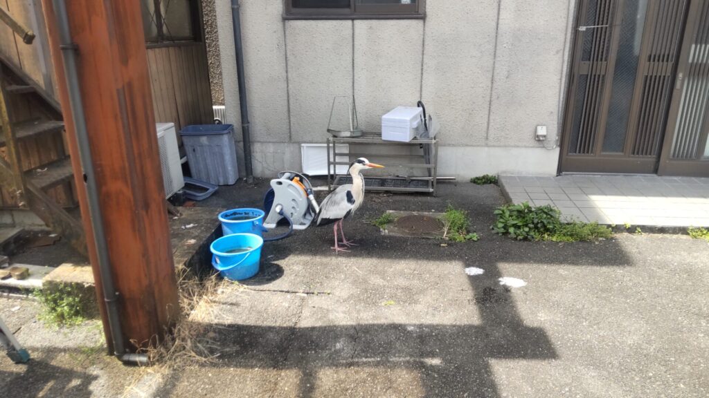 民家にサギ。